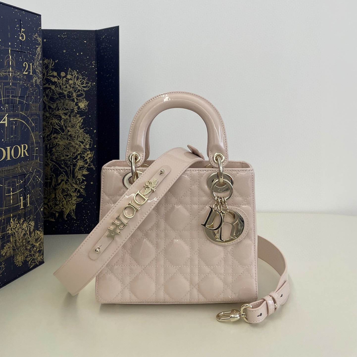 這款 Lady Dior 手袋集中體現了 Dior 對優雅和美麗的深刻洞見。采用胭脂粉色漆皮牛皮革精心製作,以藤格紋緝面線打造醒目的絎縫細節,時髦典雅的設計經久不衰。飾以淺金色飾面金屬 D.I.O.R. 吊飾,為精美的輪廓增添一分靈動。小號款式,搭配可拆卸的皮革細肩帶,可手提或斜挎。