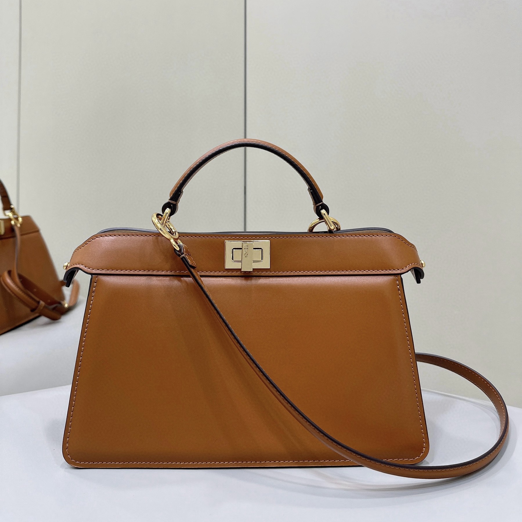灰綠色小牛皮材質,背攜時可看見底部的復古金色飾面金屬FENDI字樣。