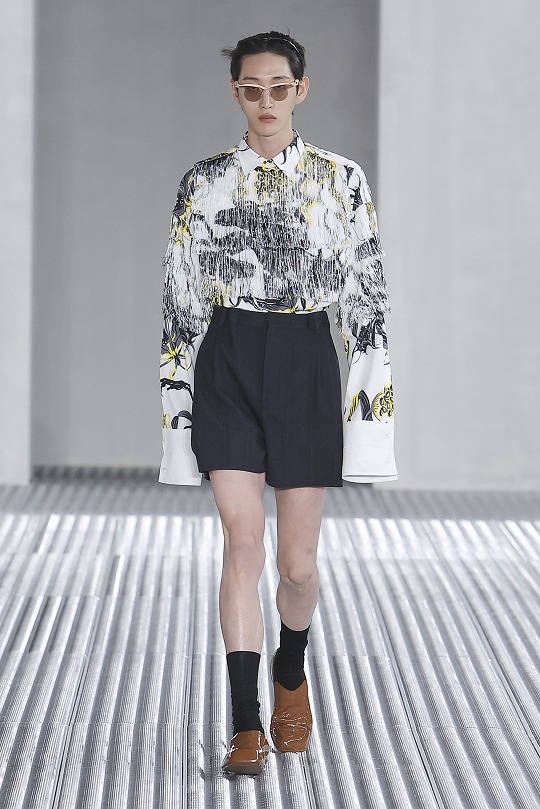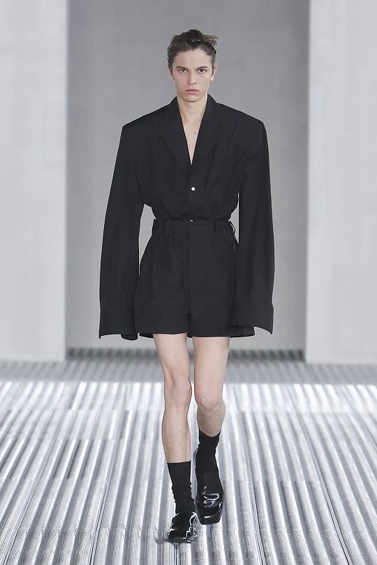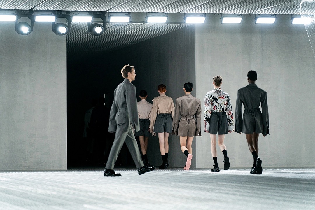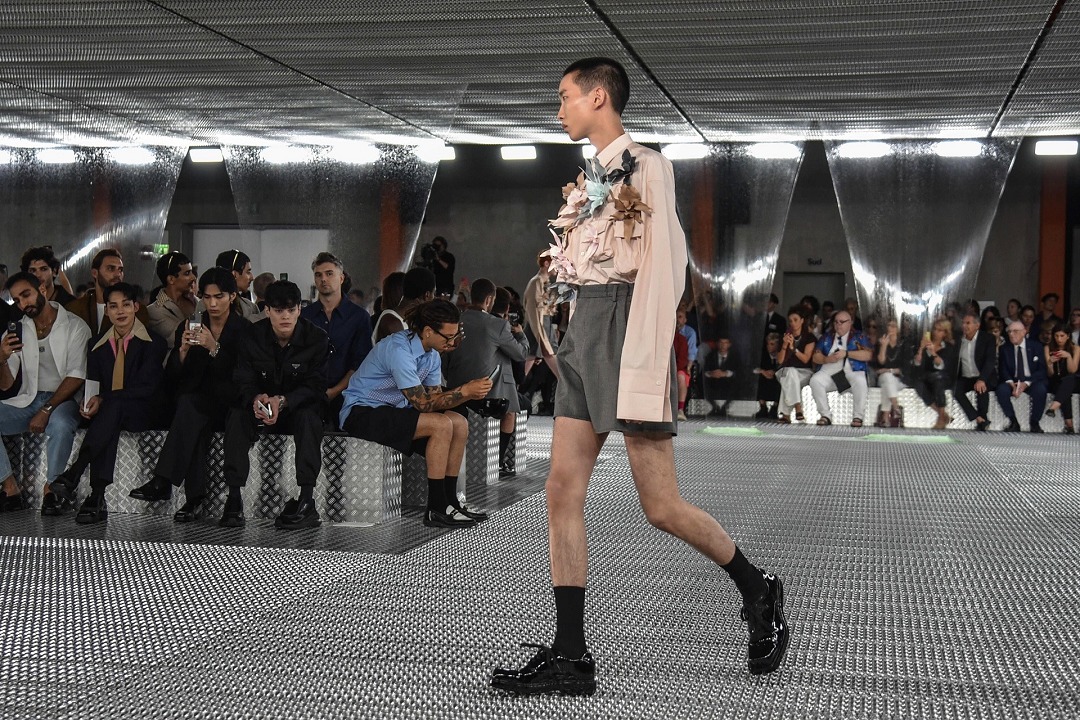 Prada 2026 春夏男士時裝秀剛剛在米蘭落下帷幕,本季作品以「流動形態」(Fluid Form)爲主題,強調身體和著裝的絕對自由。聯合創意總監 Miuccia Prada 和 Raf Simons 以襯衫的剪裁爲起點,對西裝、派克大衣和工裝馬甲等單品進行重新解構,嘗試用柔軟面料重塑1940年代流行的寬肩窄腰廓形,並搭配短褲以營造出輕盈觀感,立體胸花和流蘇等元素爲男裝作品增添浪漫細節。