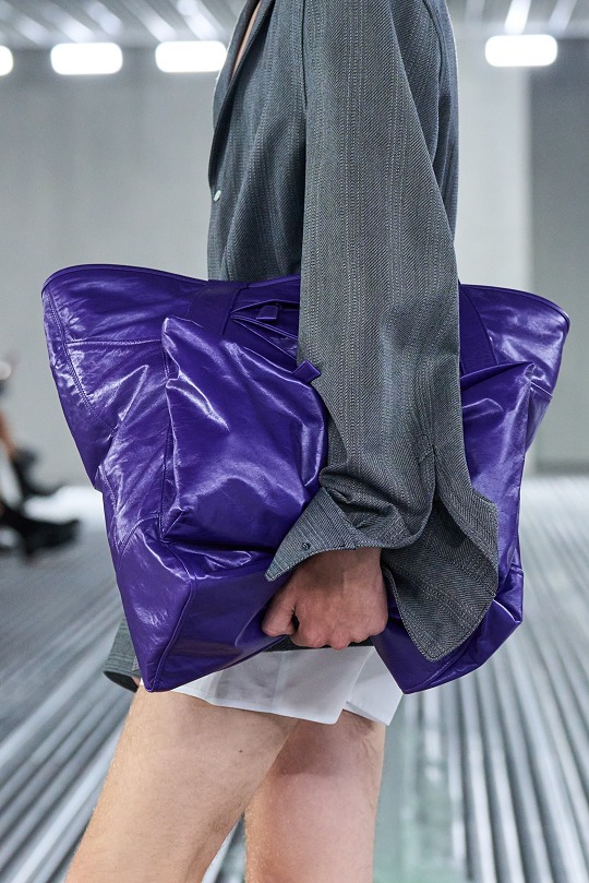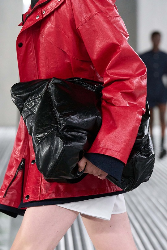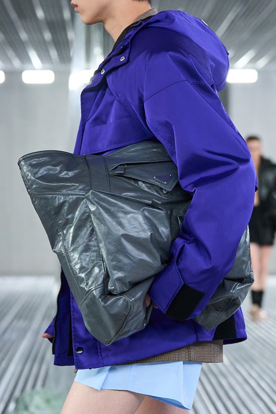 輕盈和柔軟是貫穿整個系列的核心理念,強調身體和服裝之間不拘于形的融洽。大號手提包采用柔軟蓬松的皮革制成,可以像秀場模特壹樣抱在身側營造出慵懶隨性的姿態,也可以拎在手裏或者單肩背。包包正面設有翻蓋口袋和標志性三角徽標元素,推出做舊皮革、黑色、藍灰等中性配色款式,也有綠色、紅色、紫色等亮色選擇,呈現獨特的油亮光澤質地。
