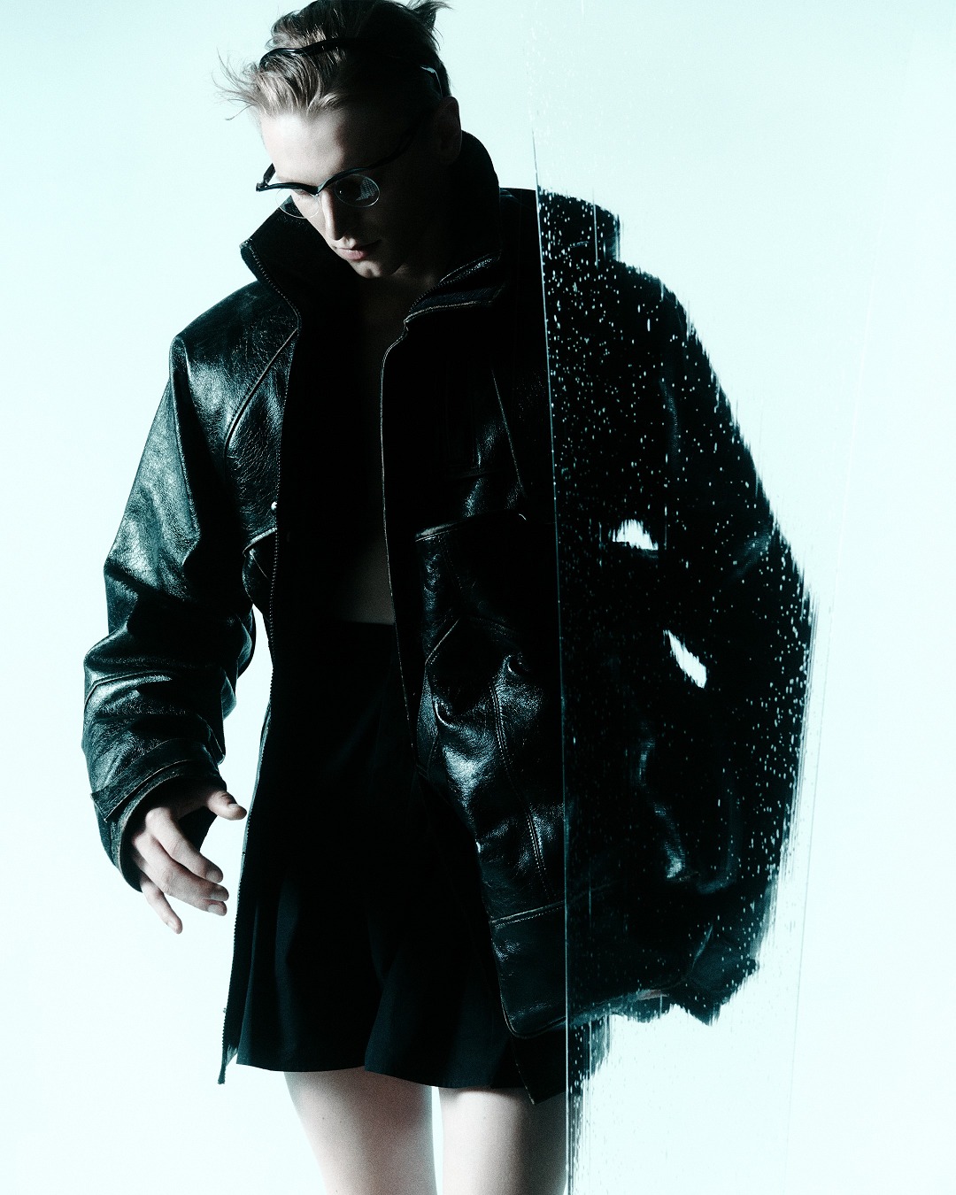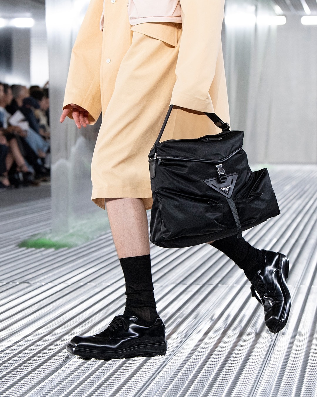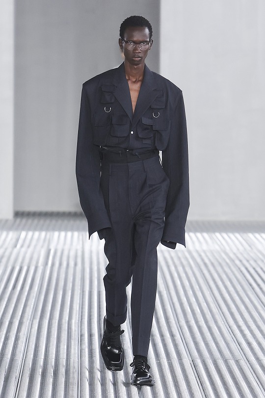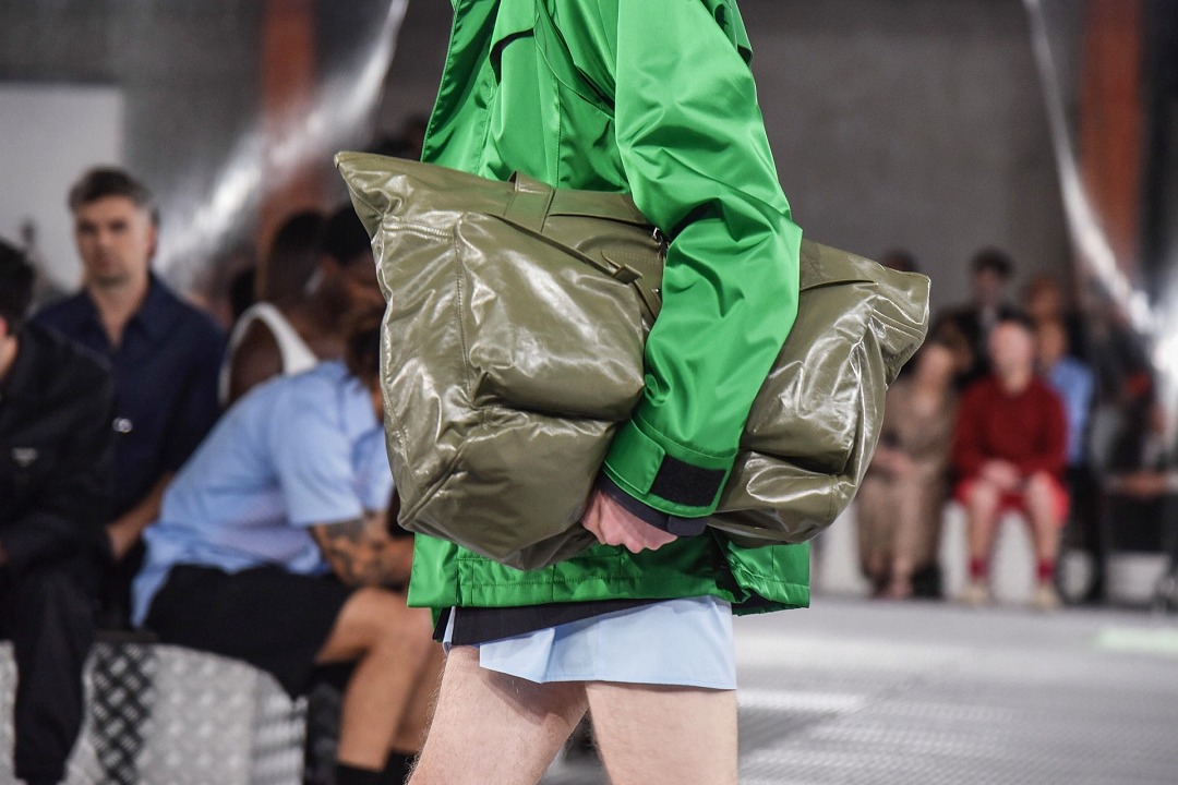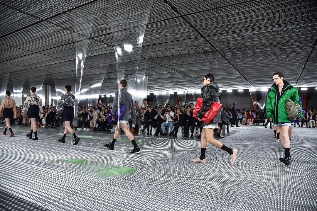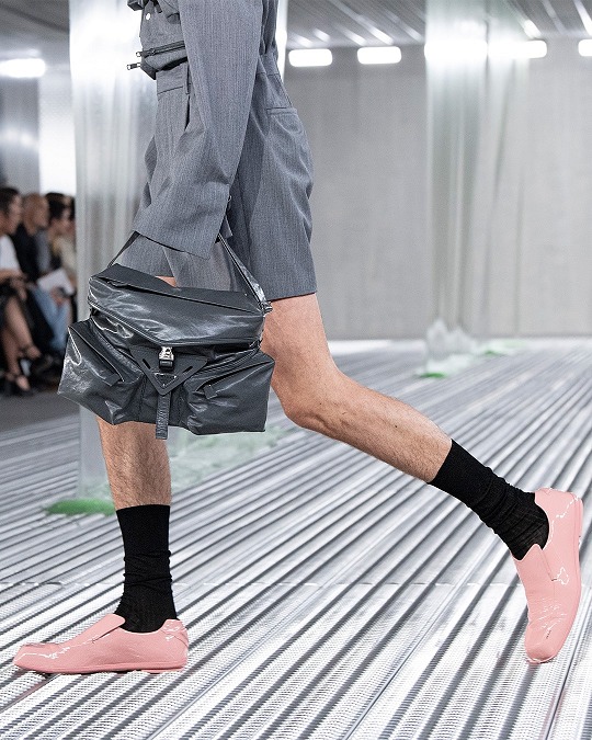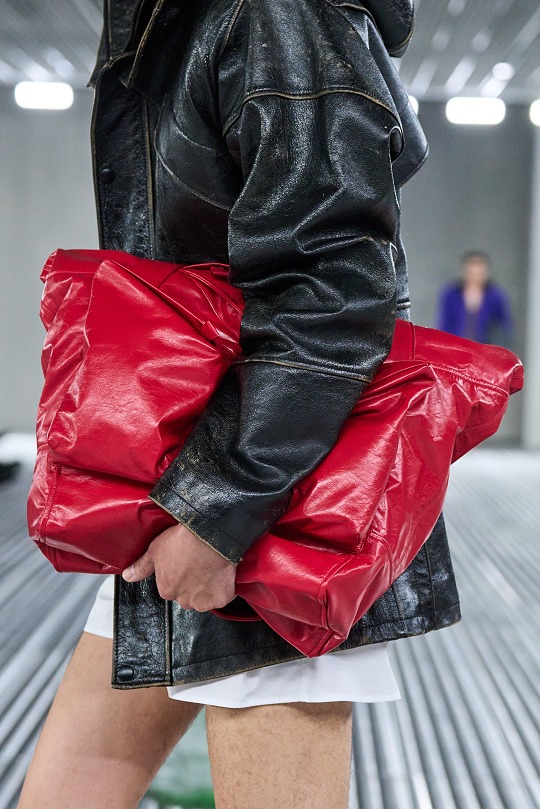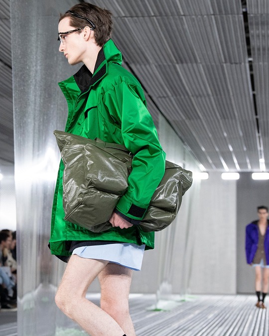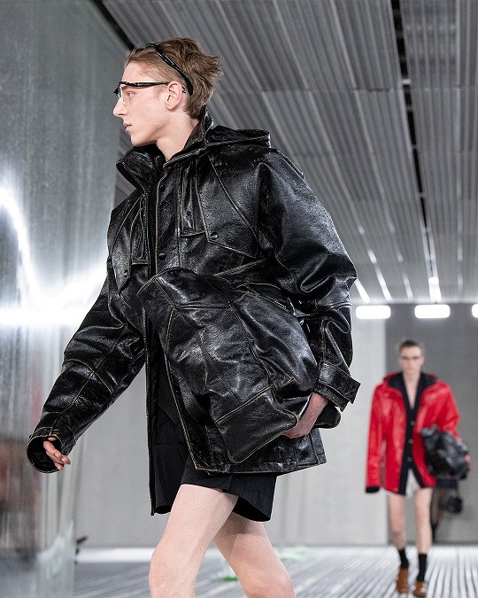 秀場置景靈感來自科幻恐怖電影《異形》(Alien),綠色的史萊姆黏液從銀色天花板中傾瀉而下,流動的屏障如抽象牆壁,構築變幻莫測的空間,模特穿行其間。包包和鞋履等配飾作品采用觸感柔軟的皮革或尼龍材質打造,強調自由無拘束的著裝概念。