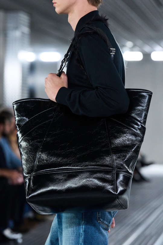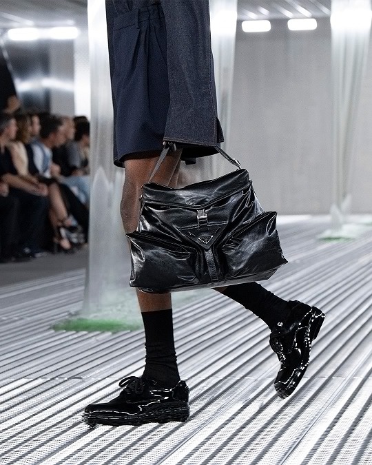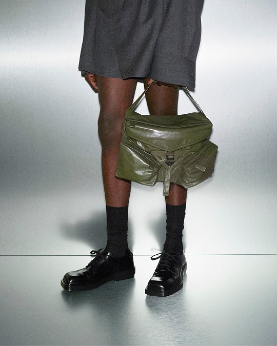 肩背包采用相對硬挺的亮面皮革材質打造,側邊斜向口袋設計爲包包增添建築感細節,肩帶可調節長短實現不同背法,秀場上發布黑色和墨綠色2款配色。