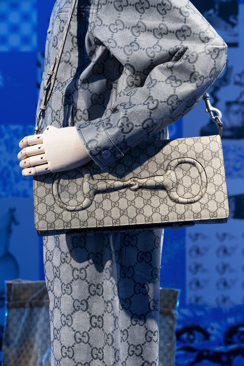 GUCCI 1953年誕生的經典「馬銜扣」(Horsebit)元素也作以放大處理,包裹老花帆布材質,營造出層次感和視覺張力。2023年亦是馬銜扣元素誕生70周年紀念,放大設計彰顯這壹經典元素的強勢回歸。