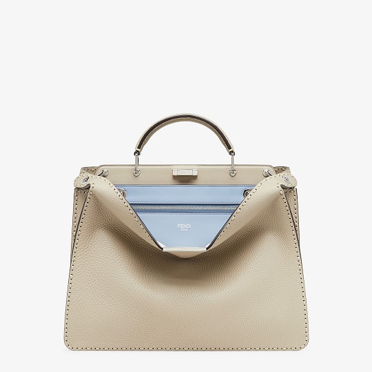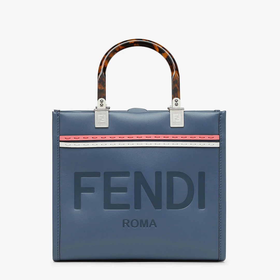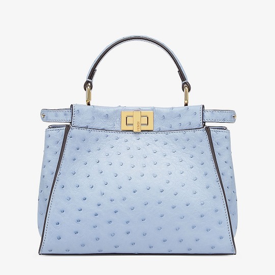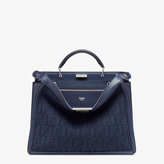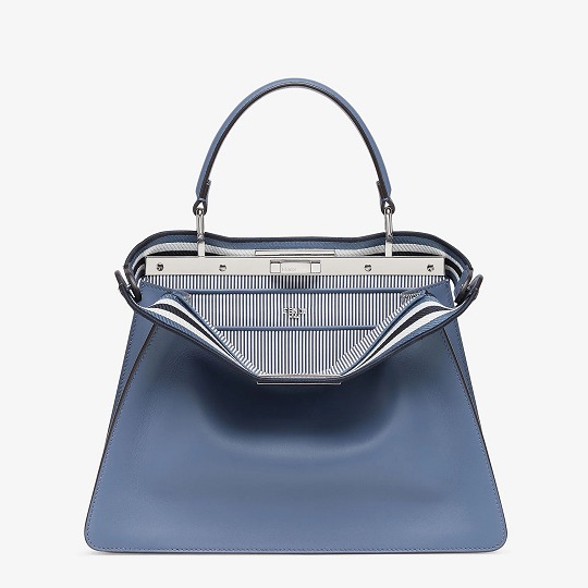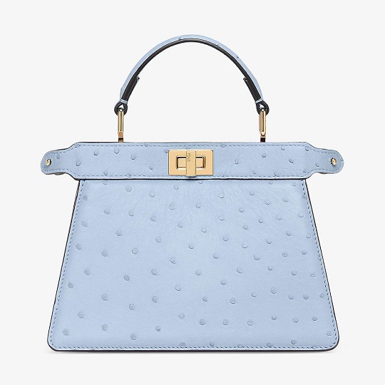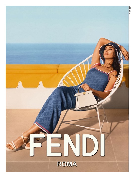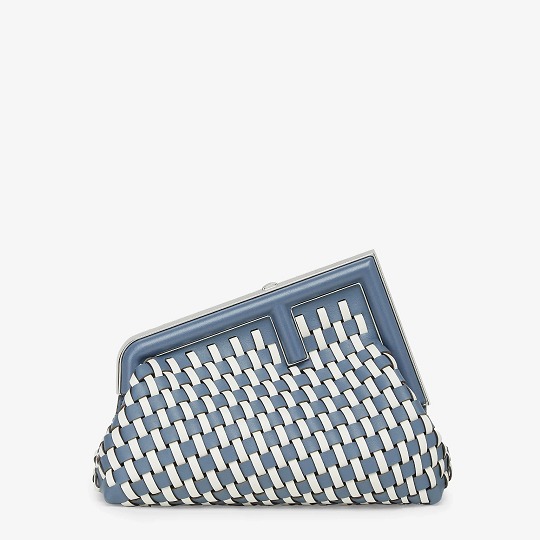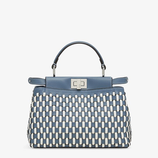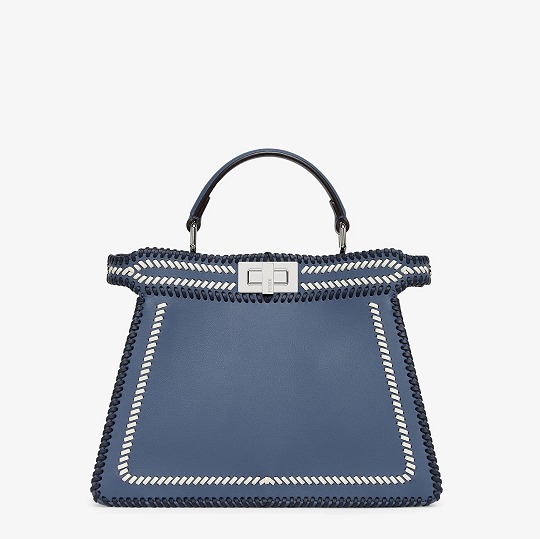 內斂深邃的地中海藍色成爲新季包包的主要基調,Sunshine 手提袋推出小號尺寸,采用25.5×22.5×12cm規格,包身壓印 FENDI ROMA 徽標並點綴粉色和白色條紋裝飾,搭配硬質玳瑁效果有機玻璃提手,寬敞托特包型爲夏日出行增加實用性。Peekaboo ISeeU 小號手袋在邊緣裝飾白色和深藍色手工縫線鎖邊,中號款搭配藍白色條紋織物裏襯,還有用藍白色皮革條編織而成的 Peekaboo 迷妳手袋和 First 手拿包,用精湛手工藝爲包包注入海濱情調。