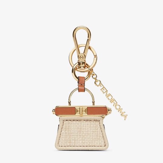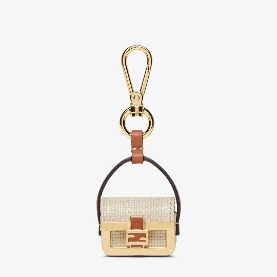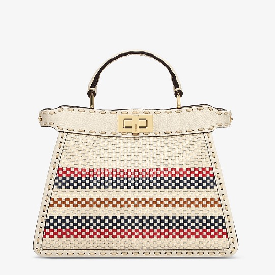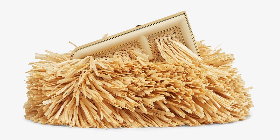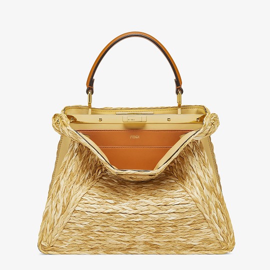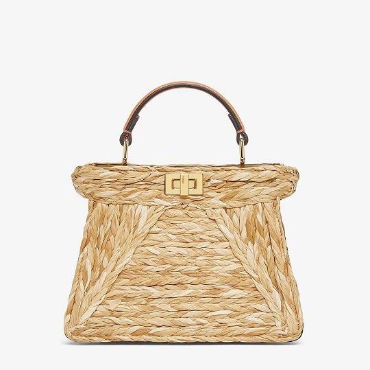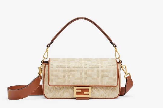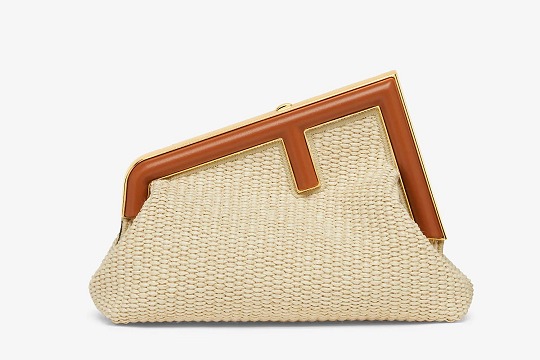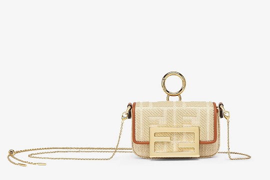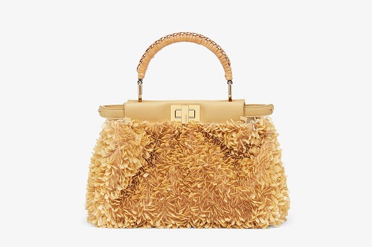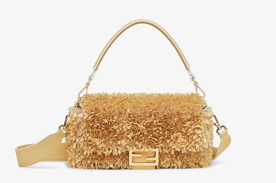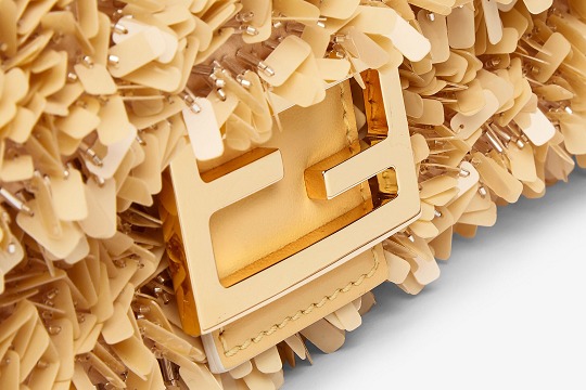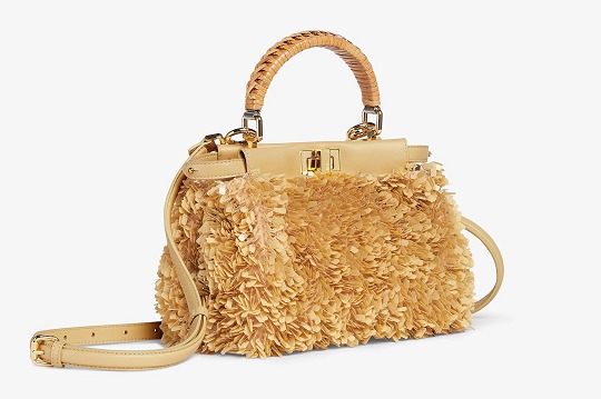 這只 FENDI First 手袋采用自然色拉菲草材質搭配狂野的手貼流蘇裝飾,「原始」氣息濃郁的包身和現代感十足的F字母金屬框形成反差。編織款 Peekaboo ISeeU 手袋保留了拉菲草的自然色調和編織紋理,流露出異域風情。經典 Peekaboo 小號手袋和 Baguette 手袋通體鋪滿沙色亮片、珠飾和金銀繡,呈現熠熠閃光的華麗風格。