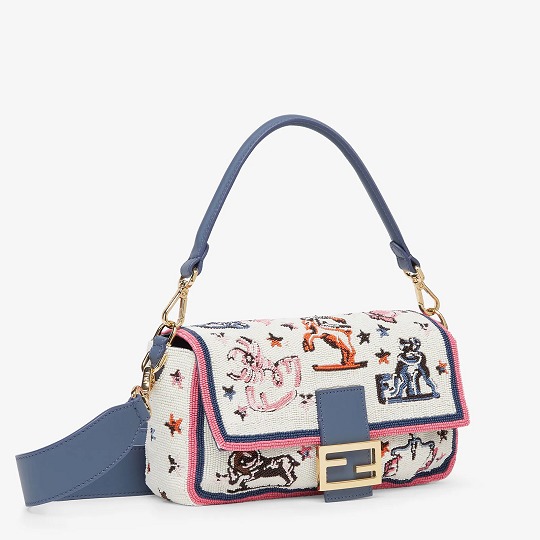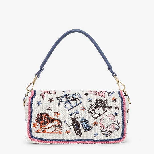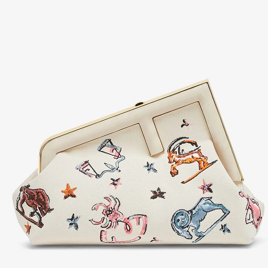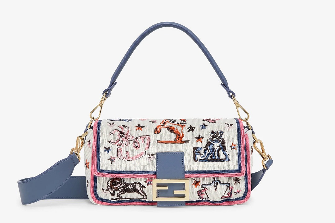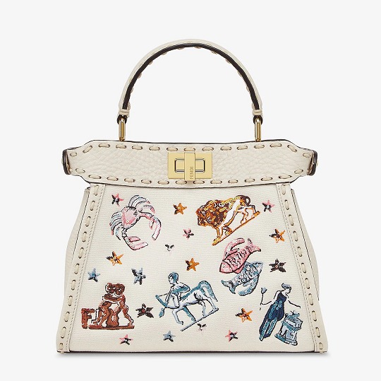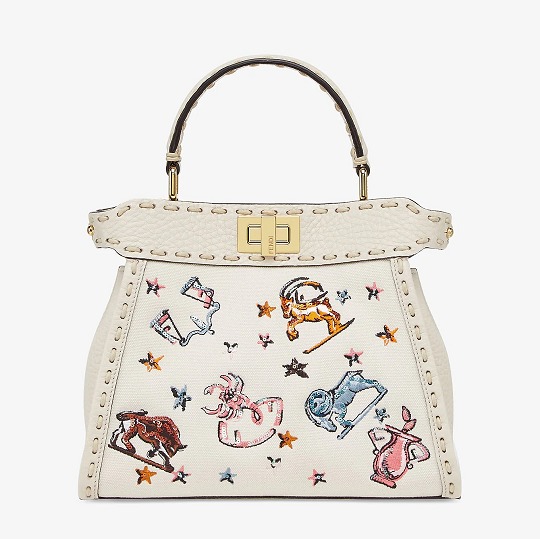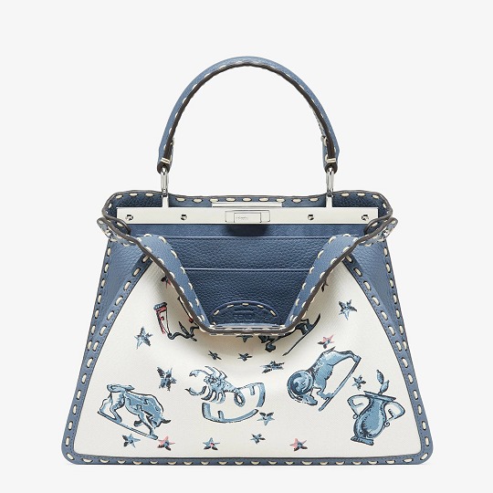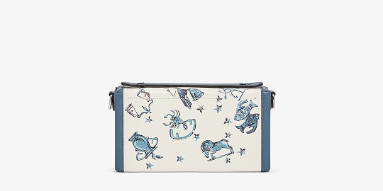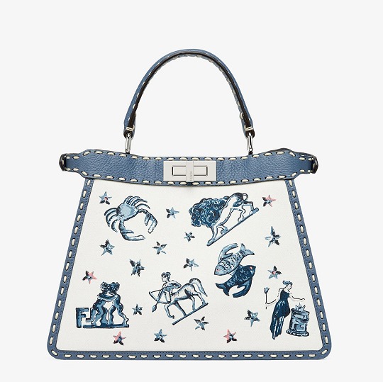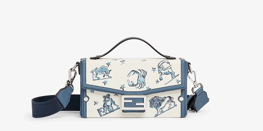 系列作品中的十二星座圖騰來自 FENDI 1990春夏系列,在星座符號中巧妙融入 FF 字母,Baguette 中號手袋以彩色珠飾和金銀繡工藝呈現華麗的 Astrology 圖案,Peekaboo ISeeU 中號和 Iconic 迷妳手袋采用皮革和帆布拼接而成,並飾以 Selleria 手工縫線鎖邊。Fendi First 小號手袋推出牛仔布和自然色帆布2款,通過刺繡及做舊工藝呈現立體星座圖騰,爲包包增添浪漫氣息。
