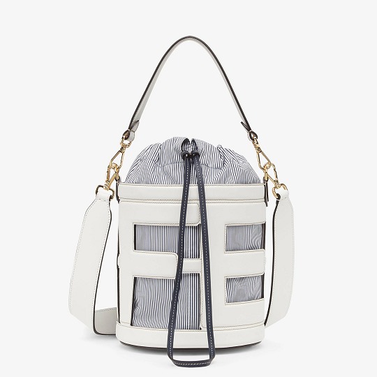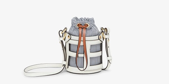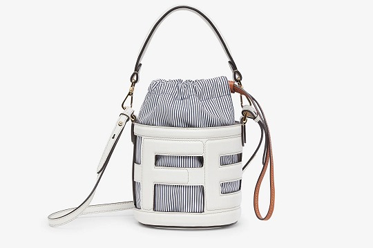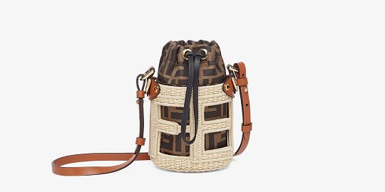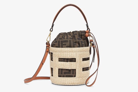 Step Out 水桶包推出常規、小號和 Nano 吊飾包3種尺寸,除了經典的棕色皮革搭配 FF 提花布料款式,本季新增自然色草編材質和藍白條紋款,包包采用抽繩開合,配有可拆卸提手和長肩帶,可實現手提、肩背、斜挎等多種造型方式,慵懶隨性的水桶包型自帶假日氣息。