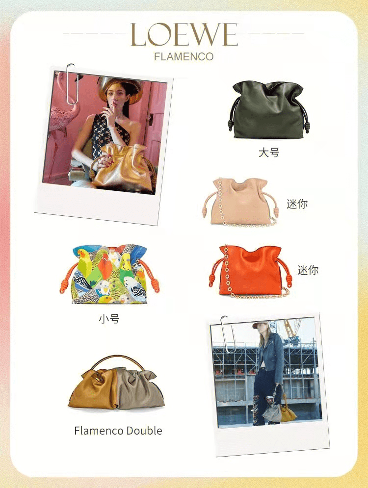 LOEWE 2026早秋系列新壹季手袋作品以清新色調和精巧尺寸亮相Flamenco 手袋搭配甜甜圈造型鏈條或飾以熱帶鹦鹉印花經典 Amazona 系列推出迷妳小方包和 Pouch 手包尺寸,充滿複古學院氣息。