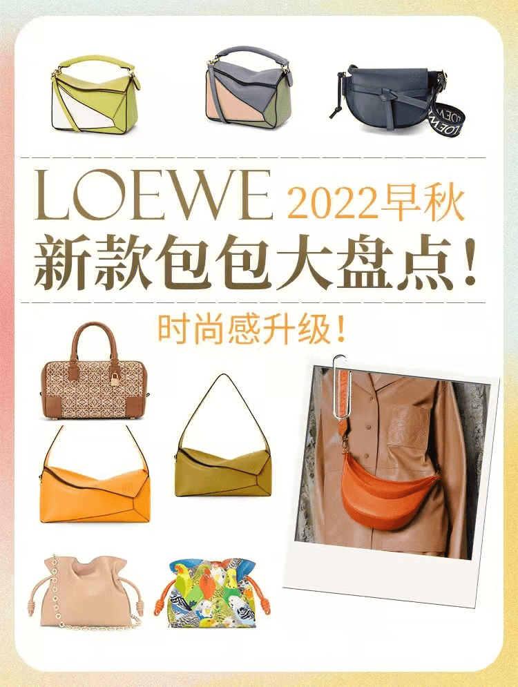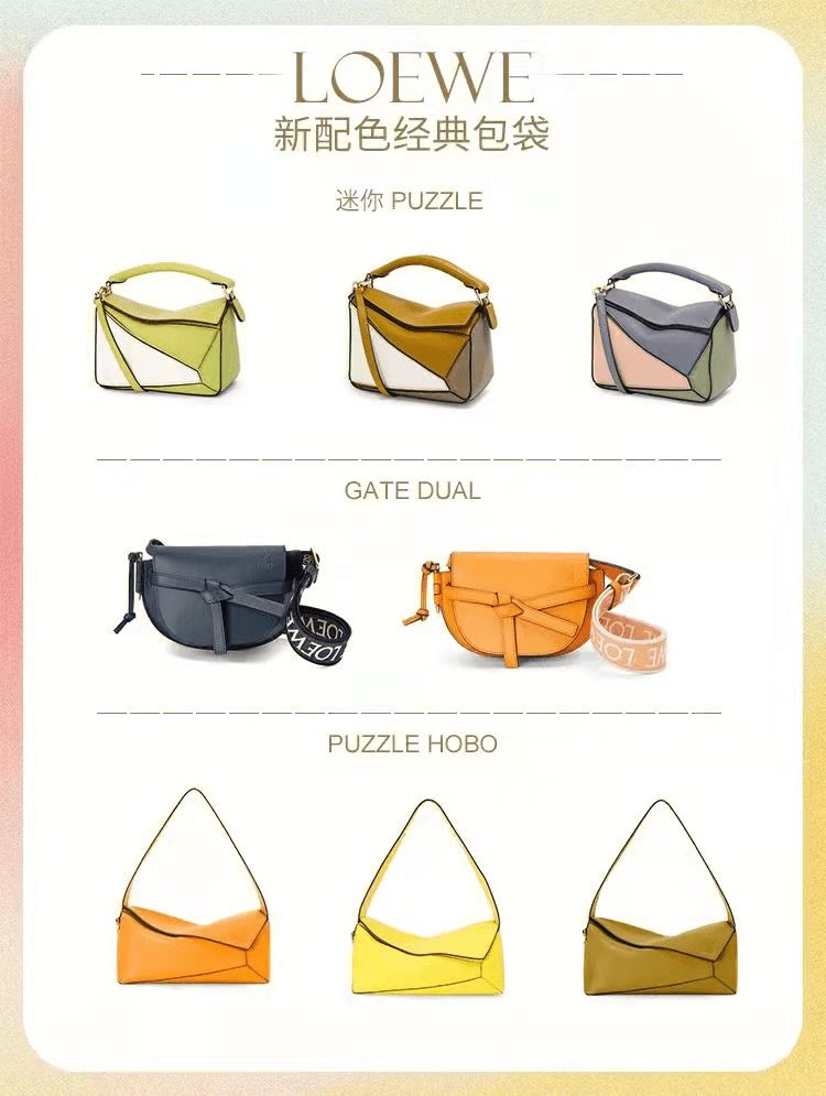 Puzzle 手袋、Gate 馬鞍包、Hammock 吊床包、Luna 月牙包等包款則煥以明亮新配色登場最引人注目的是橙色、黃色、沙色等暖色系,看起來活力十足提花寬肩帶爲包包增添休閑氣息。