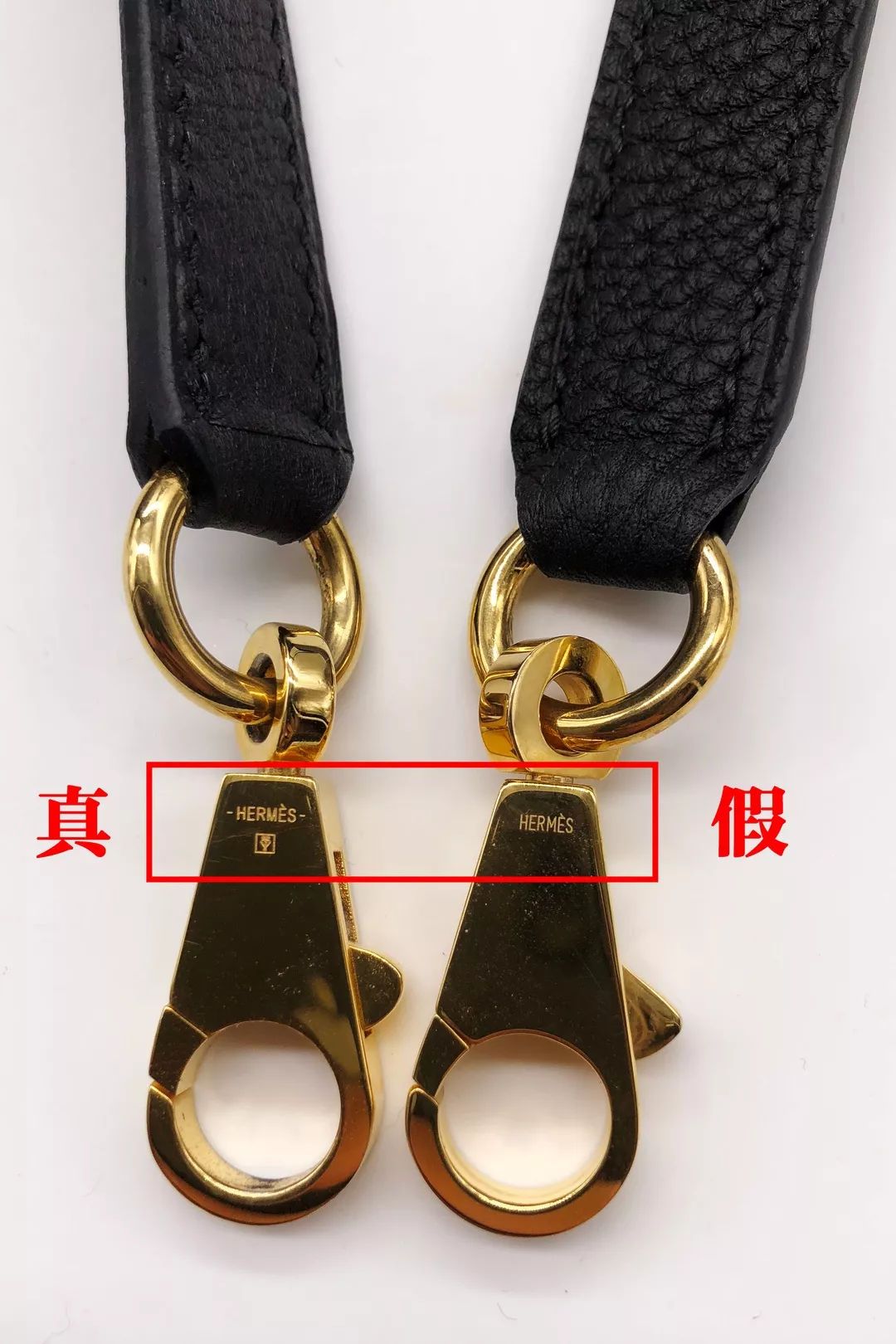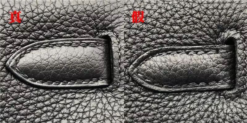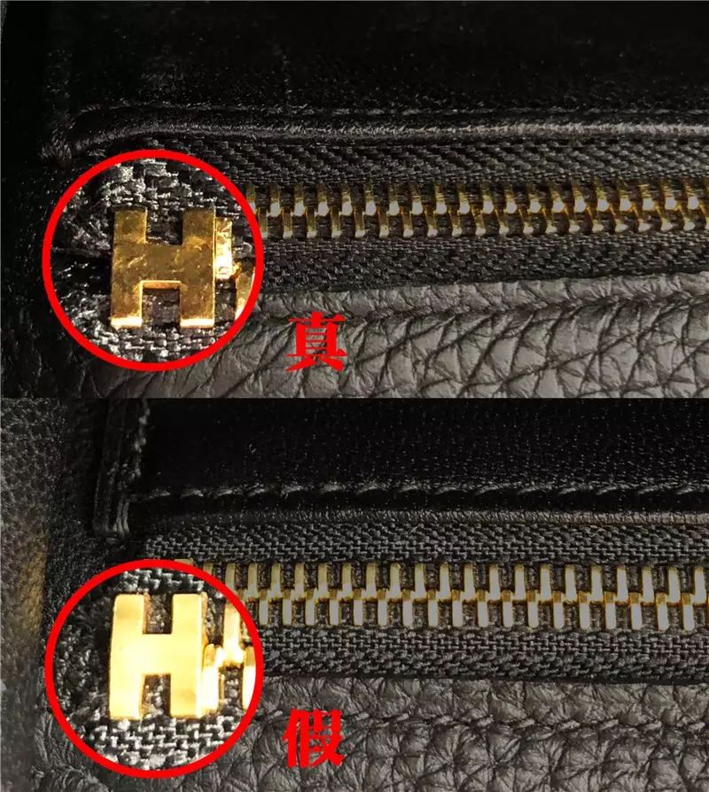 真包拉鏈尾部的表面不是光亮,因爲制作的時要手工或沖壓機壓實,所以會留下加工痕迹。但是放大觀察邊緣,H四個角是圓滑的。愛馬仕講究手工及佩戴舒適感,小零件的做工體現,是鑒定的核心。假包的拉鏈尾部做工比較平整、光亮,看上去比真包還漂亮,但是放大發現,邊緣沒有倒角,摸起來有刺手感。
