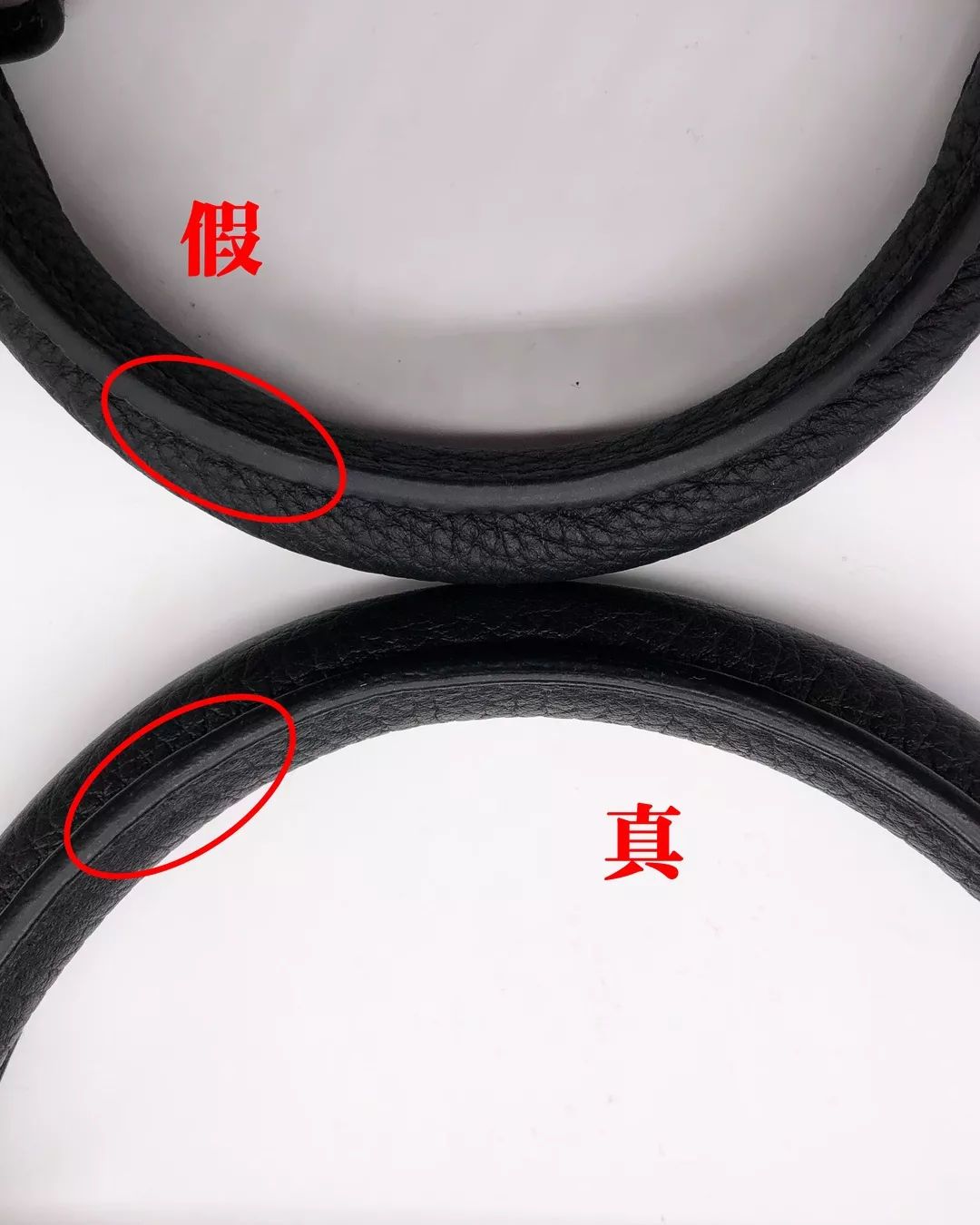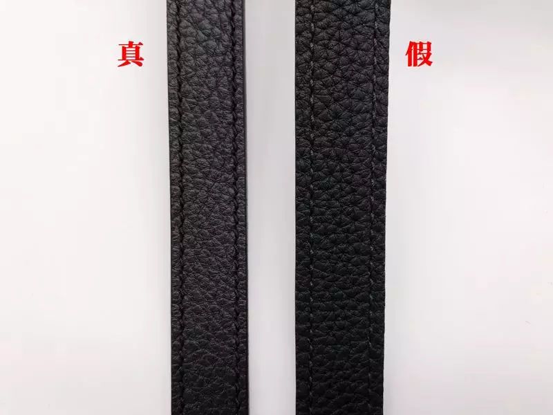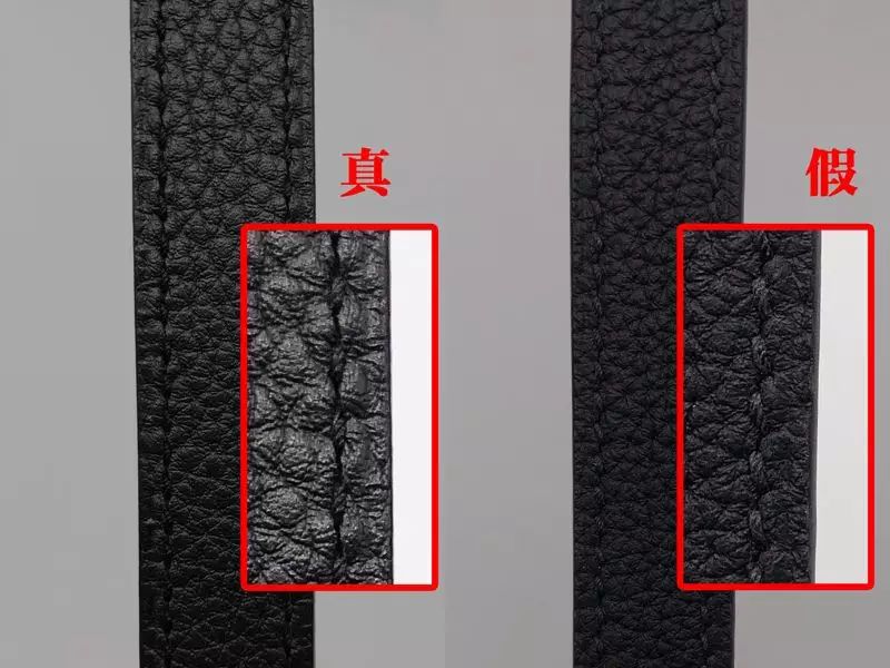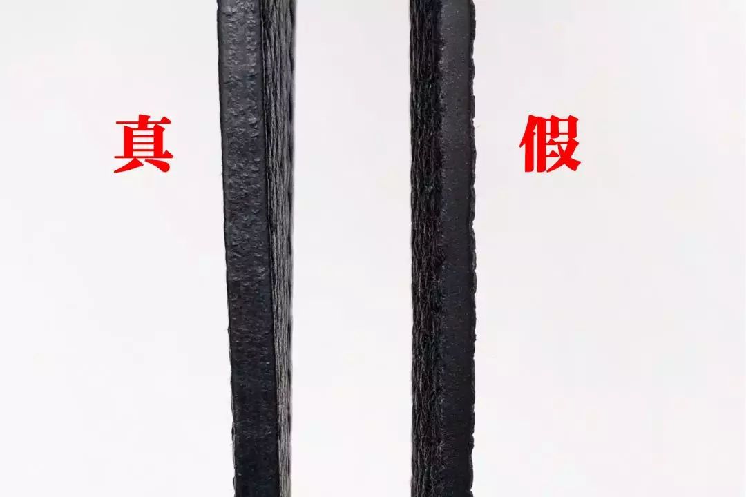將兩只包包的肩帶放在壹起對比,發現真包的油邊厚度也比假包更爲厚實,並且真包肩帶油邊是亮面的,假包則是啞光的。