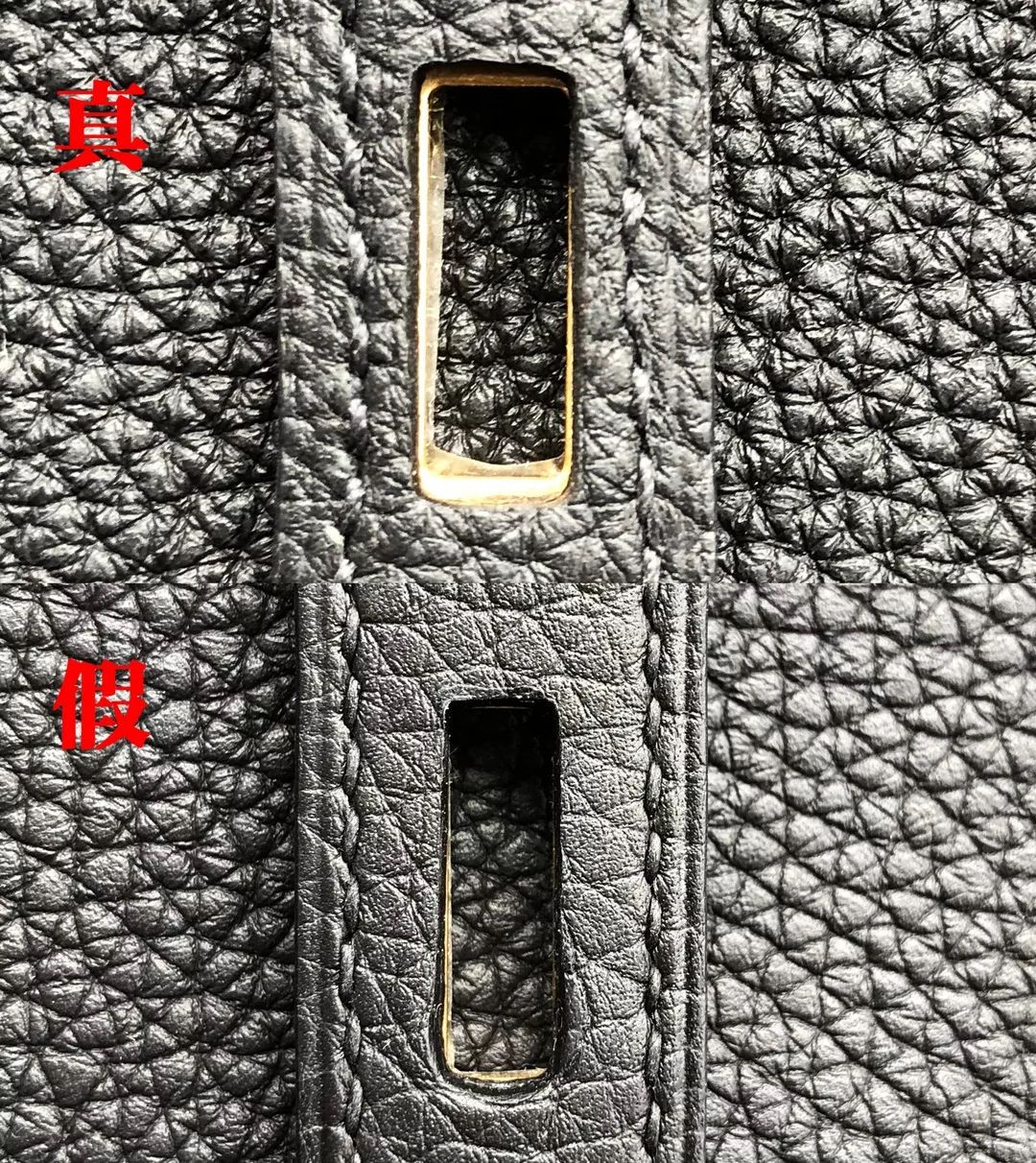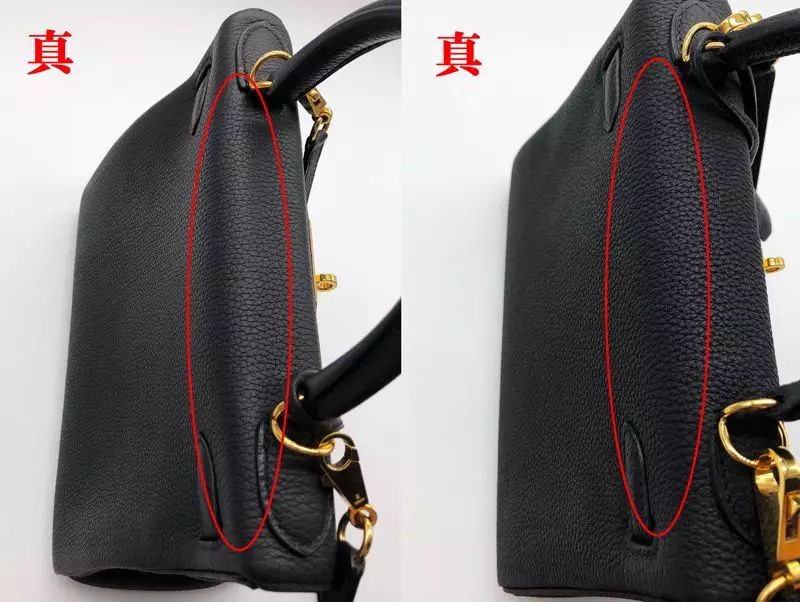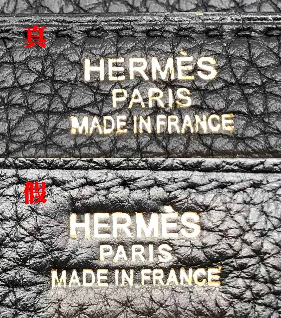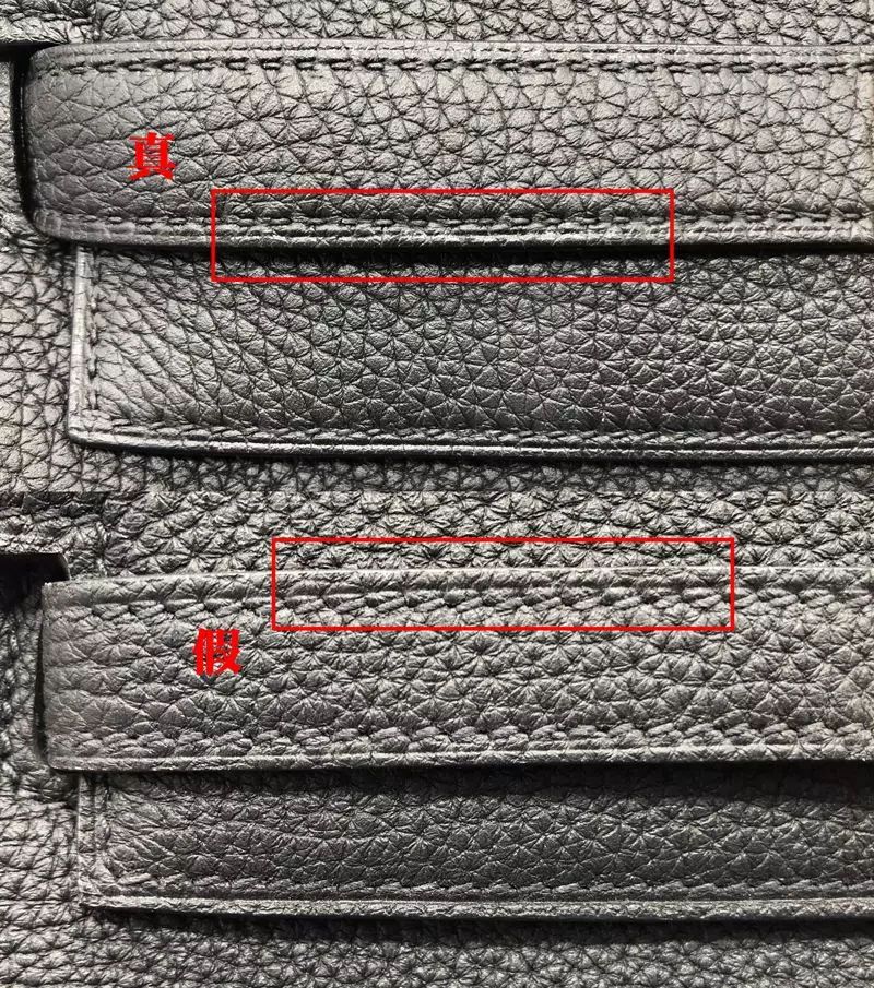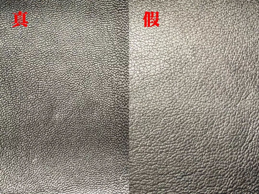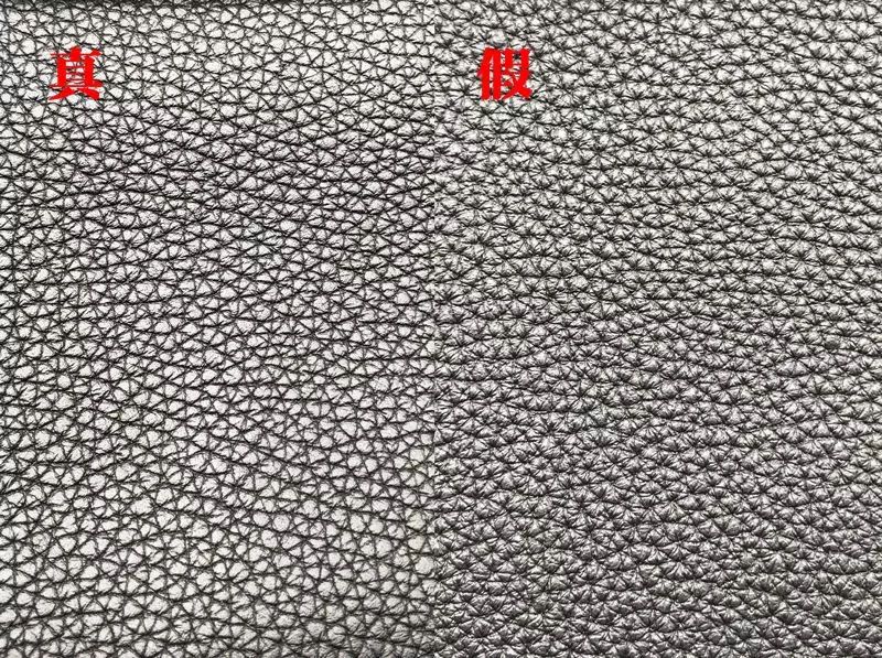此次我們鑒定的Hermes是Togo皮,是用成年公牛的頸部皮做成的,看起來很像荔枝皮,皮質比較硬挺,表面顆粒大、顆粒感飽滿且光澤度好。而假包的紋路過于明顯和雜亂,導致顆粒感不夠飽滿,且缺少壹定的光澤度。