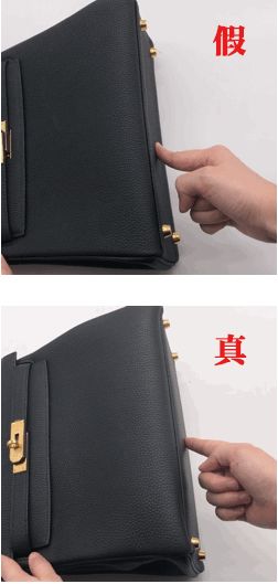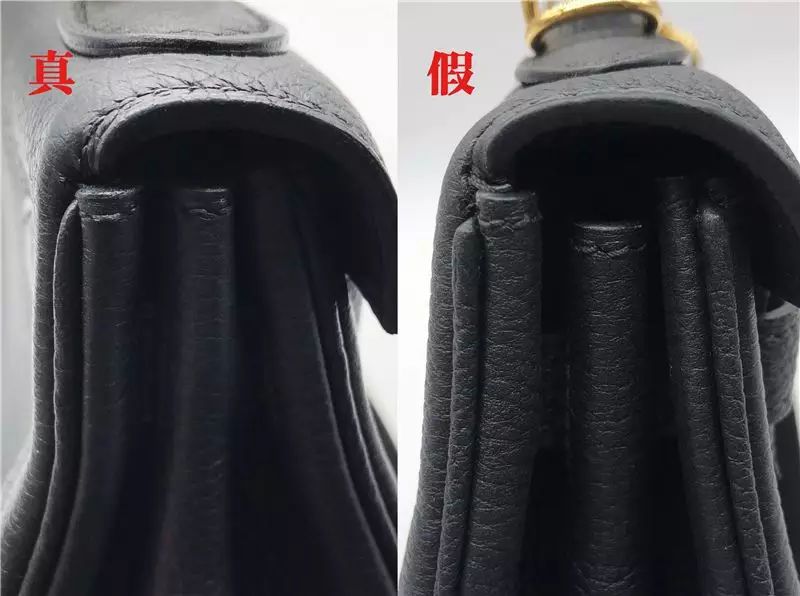 真包的包蓋轉折處,棱角明顯要比假包明顯,有硬挺之感,造型十足。而假包(右)是比較圓滑的,造型不夠挺括,十分容易變形。