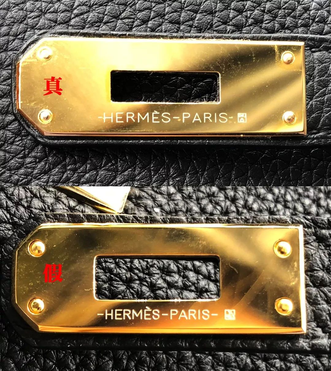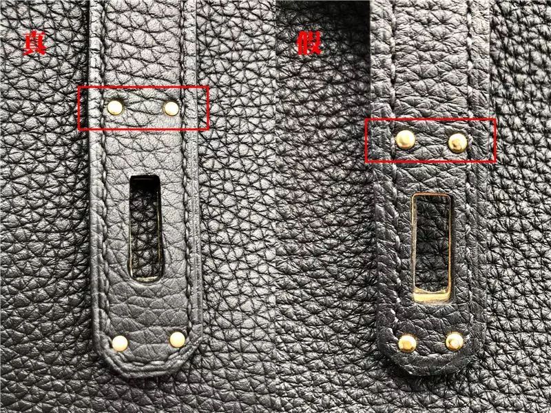 鎖的底部也有愛馬仕的logo刻字,真包的刻字清晰,字體精致,鎖孔小而光滑,曲線優美。假包刻字有沖壓擠出樣,字體粗且模糊,鎖孔也比較粗糙。最重要的是,真包的鎖孔方向指向愛馬仕logo,而假包的鎖孔方向指向鎖底部的編號。