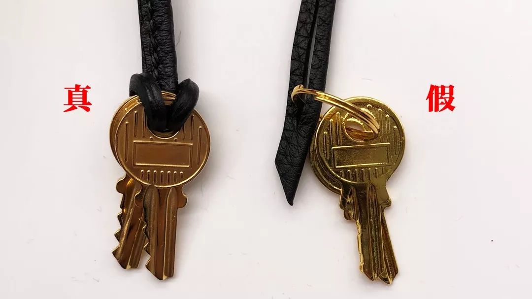 這個細節可以說是很明顯的缺陷了:真包的鑰匙是用皮繩將鑰匙固定銜接住的,而假包竟然使用了壹個圓環鑰匙扣,廉價感撲面而來。此外,真包的鑰匙是高級的啞光質地,而假包鑰匙是亮面的。
