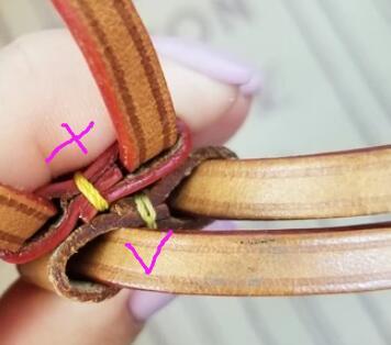 3)Neverfull的手提帶子很細,並固定在袋子上,還有壹個D形環將提手連接到包上。“ V”針腳實際上是“ LV”(以45°角觀看時爲L,而直接觀看時爲V)。 V形的每壹側只有5針。