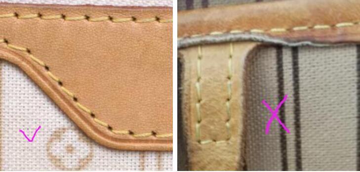 1)真的Louis Vuitton包在縫制時要非常小心,僞造的人通常不重視這個要素。