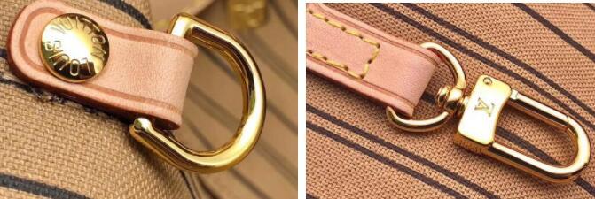 1)拉鏈的複制難度較大。 LV的五金硬件是顔色稍深的青銅,具有啞光的質感,而不是亮金色的金屬。而假冒的LV Neverfull的拉頭帶有黃色底色的銀色,且過于有光澤。
