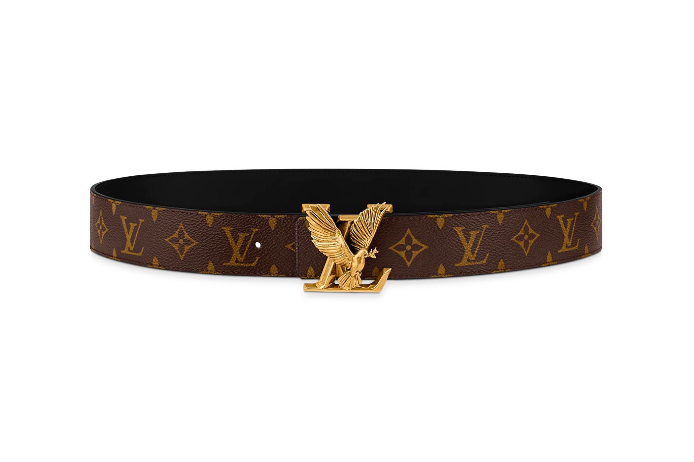 該款皮帶采雙面設計,在正面飾上 Louis Vuitton 經典 Monogram、背面采用同色小牛皮制作,並提供多種長度選擇;而核心亮點則爲正面扣環處的金屬裝飾,將 LV 字樣結合銜著橄榄枝的鴿子圖案,呈現 Virgil Abloh 寄予品牌的願景。