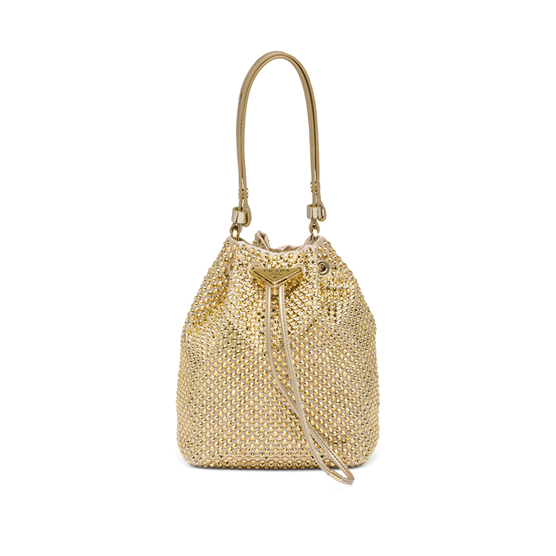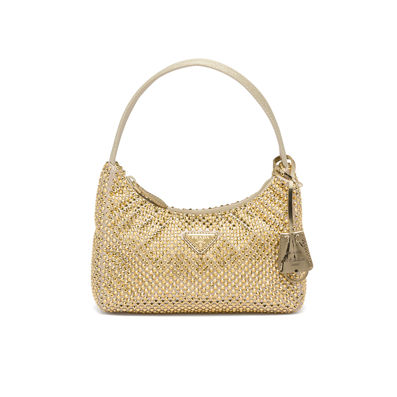 結合人氣紅不讓的迷妳半月形手袋,在七夕情人節跳脫過去壹貫的尼龍包面,打造奢華的綢緞版本,並在包面上鑲嵌上滿滿的金色水晶,以及金色搪瓷三角形標志和金屬光皮革吊飾,讓妳心愛的她無論是白天或黑夜,走到哪裏都閃亮迷人。