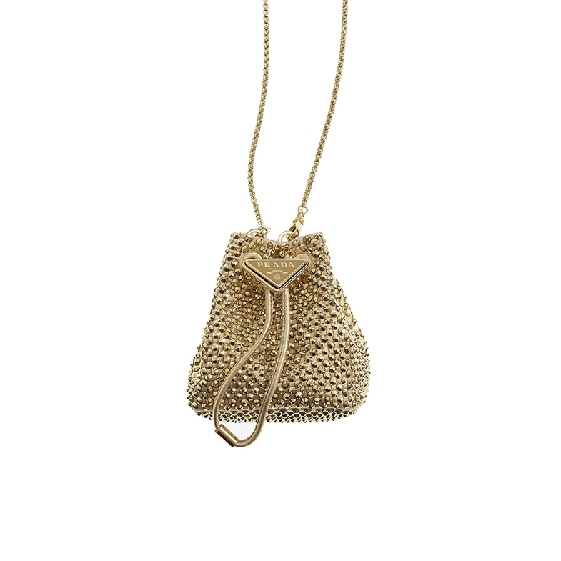 呼應時下迷妳包熱潮Prada把水桶包縮小、縮小再縮小,變身能挂在脖子上的項煉或是綁在現有包款的小巧子母包,宛如壹個閃亮精致的小福袋,讓妳無論正式或休閑都能選戴,而且因爲款式中性所以無論是男生或女生使用沒問題,讓所有七夕愛侶都能靠它點亮情侶裝。