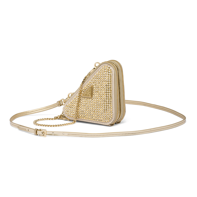 同樣也是走迷妳包路線,Prada以玩味的迷妳斜背包呈現標志性三角形Logo,滿滿的金色水鑽讓簡約幾何形包款充滿造型性,讓妳能壹路從白天背到晚上,非常適合帶著它去吃浪漫七夕情人節晚餐,讓時髦金色配飾渲染專屬于妳和他的浪漫邂逅。