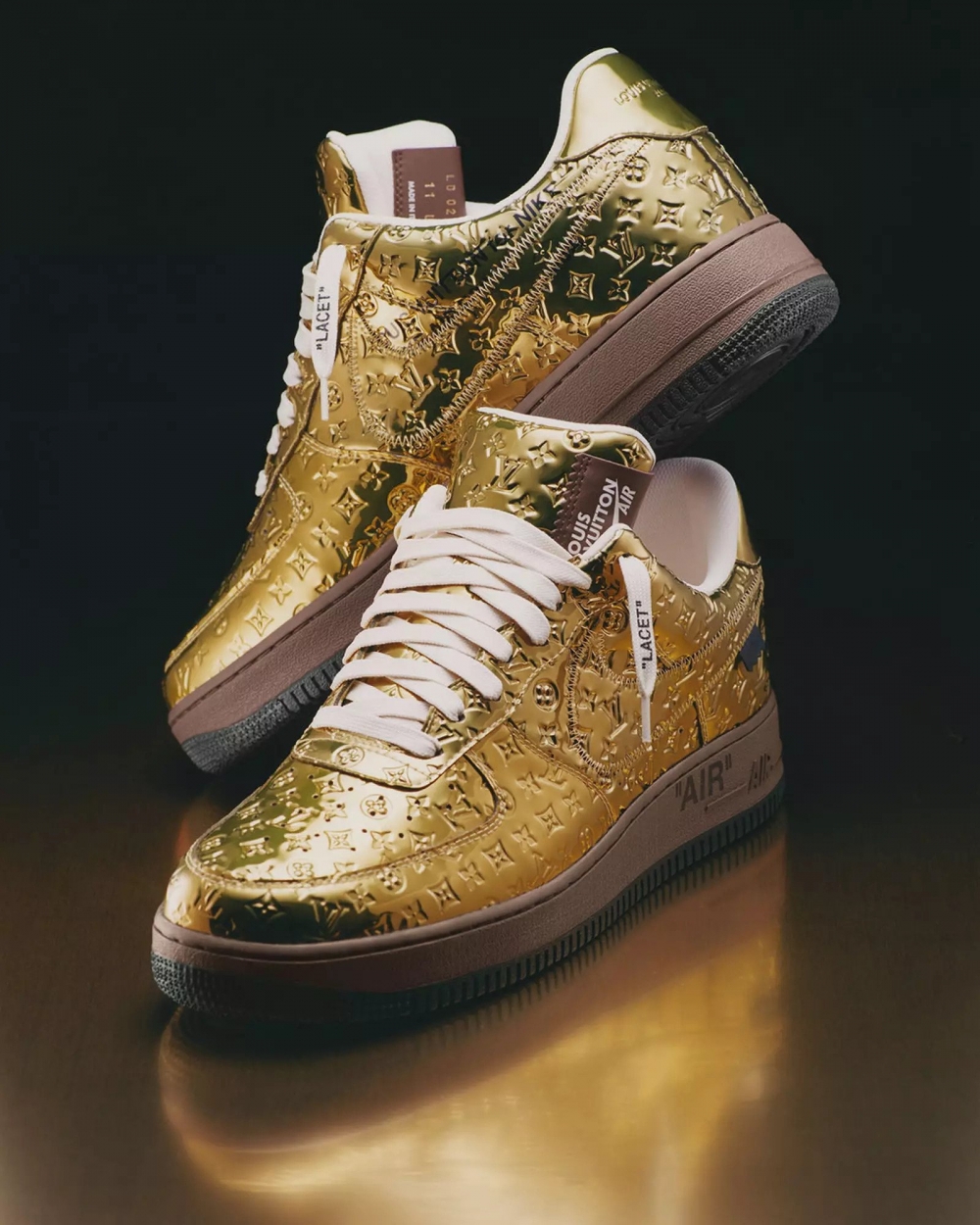 所有鞋履均在Louis Vuitton義大利的工作室制作,經典的球鞋透過Louis Vuitton精湛的奢華面料呈現,細節加入Virgil Abloh專屬字體HeLVetica,鞋帶上的”Lacet”字樣與鞋底上的”Air”字樣,將兩大身份的標志融爲壹體,彰顯此次合作的精華。