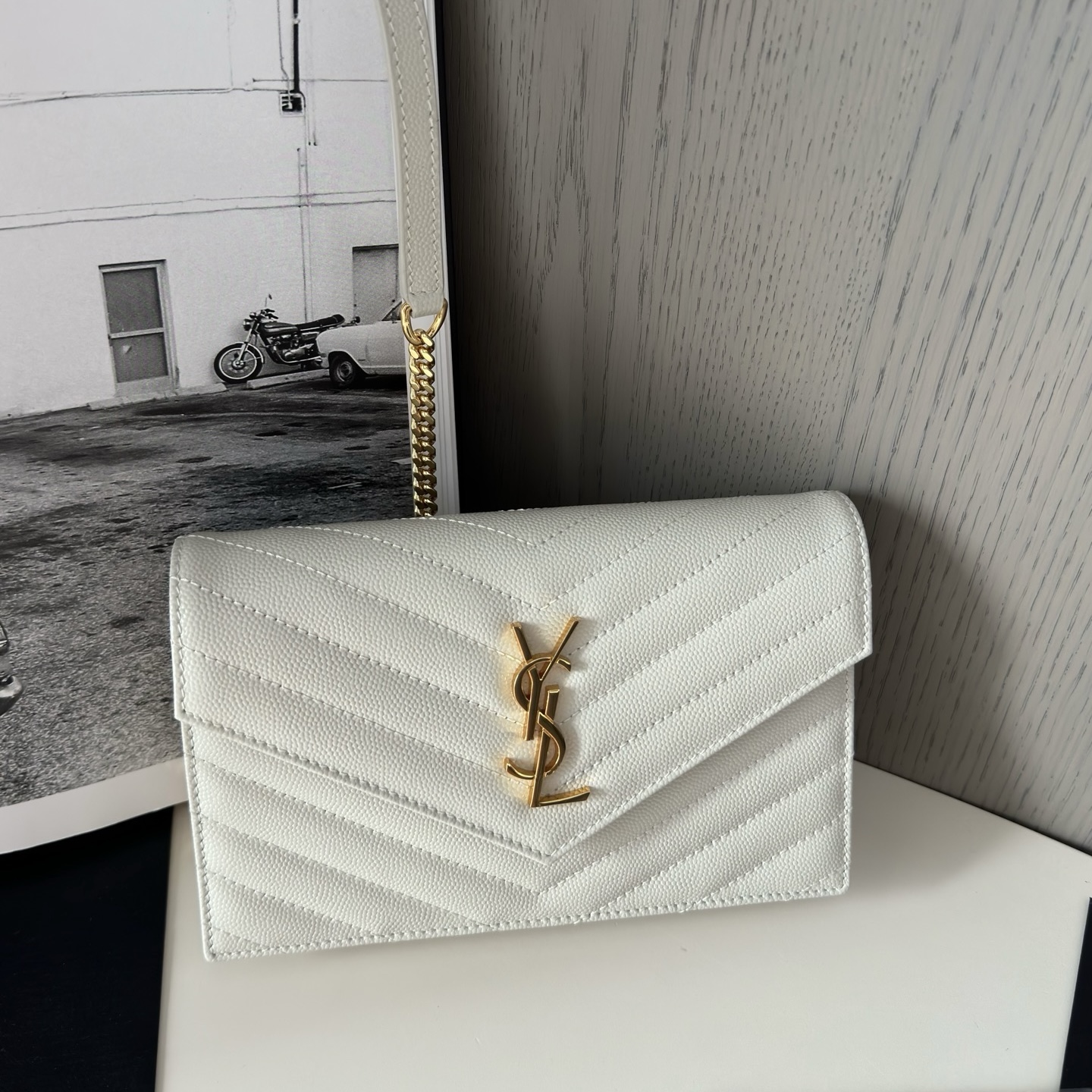 鏈條錢包,飾以LE CASSANDRE和標誌性V形絎縫明縫線。