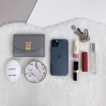 中夹x1/护手霜x1/气垫粉饼x1/iPhone 12 pro/唇膏x2/护唇膏x1/钥匙/随身小香水