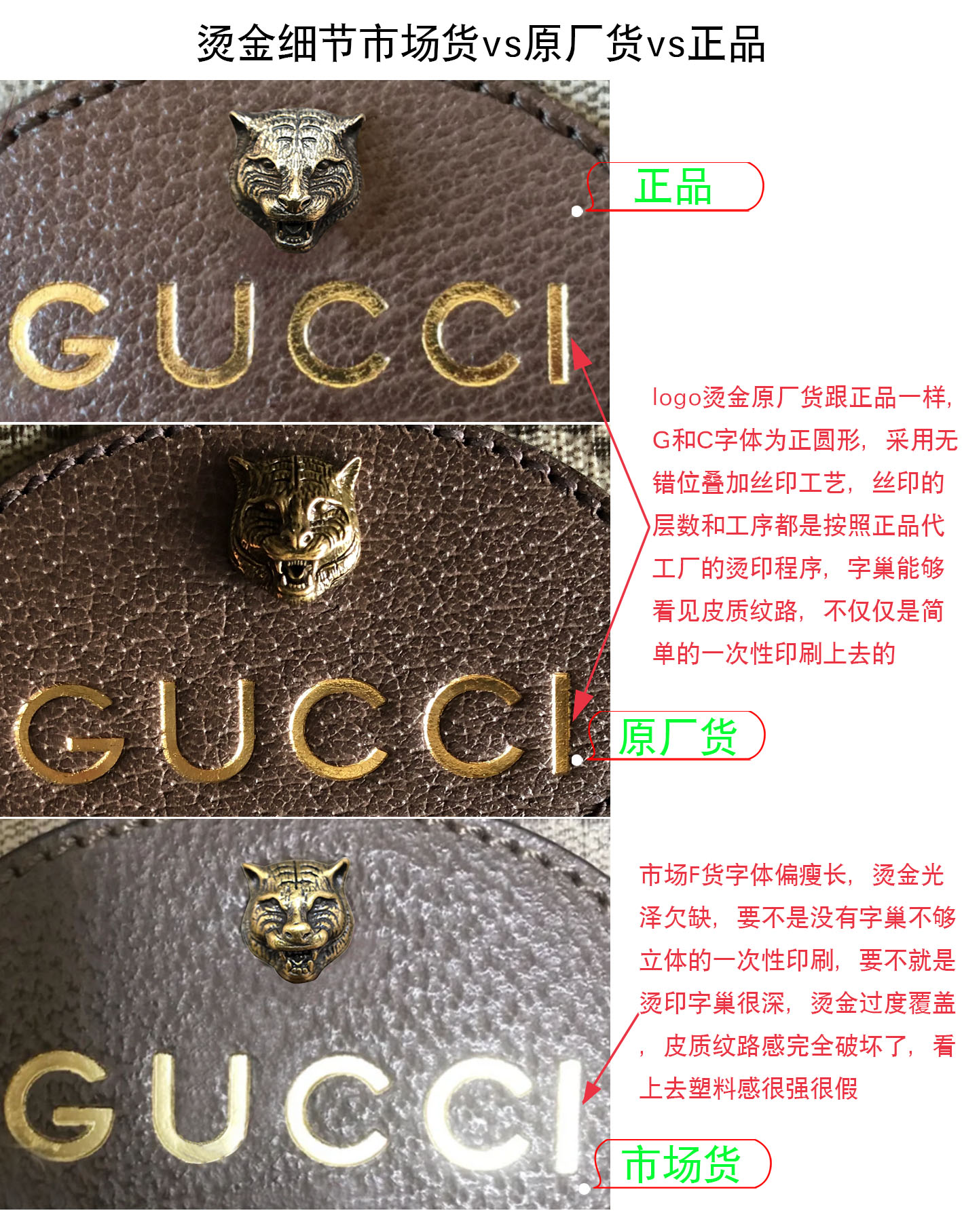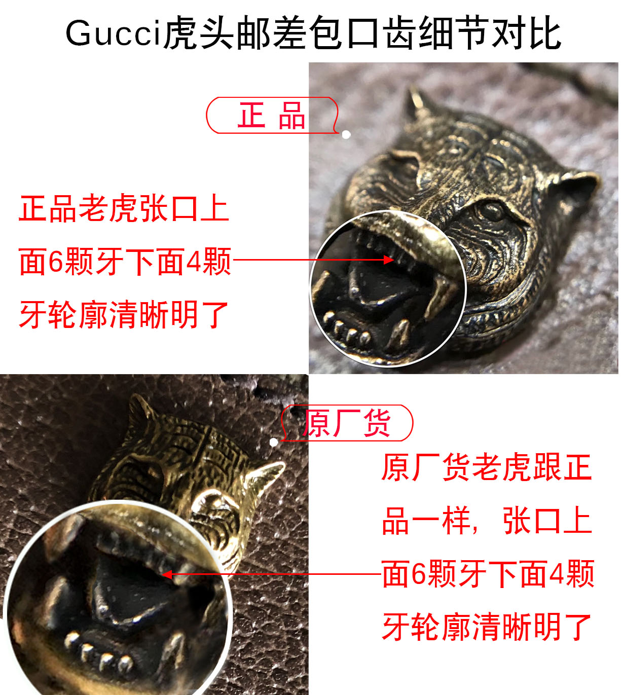既然这款包名字叫虎头包,那它的鉴别重点就在虎头了,仔细看下面的对比图中的虎头,市场货各种形状的都有,但是总结起来就是刻画不够精细,纹理少而粗糙,牙齿的位置和数量都不对,总体看上去缺少逼真感;正品虎头纹理多且刻画清晰,而且摸上去纹路多且有阻力,颜色上是偏黑的,是那种黑中带金的感觉,牙齿是上6下4,霸气而不失可爱,总体看起来是那种栩栩如生的逼真感。