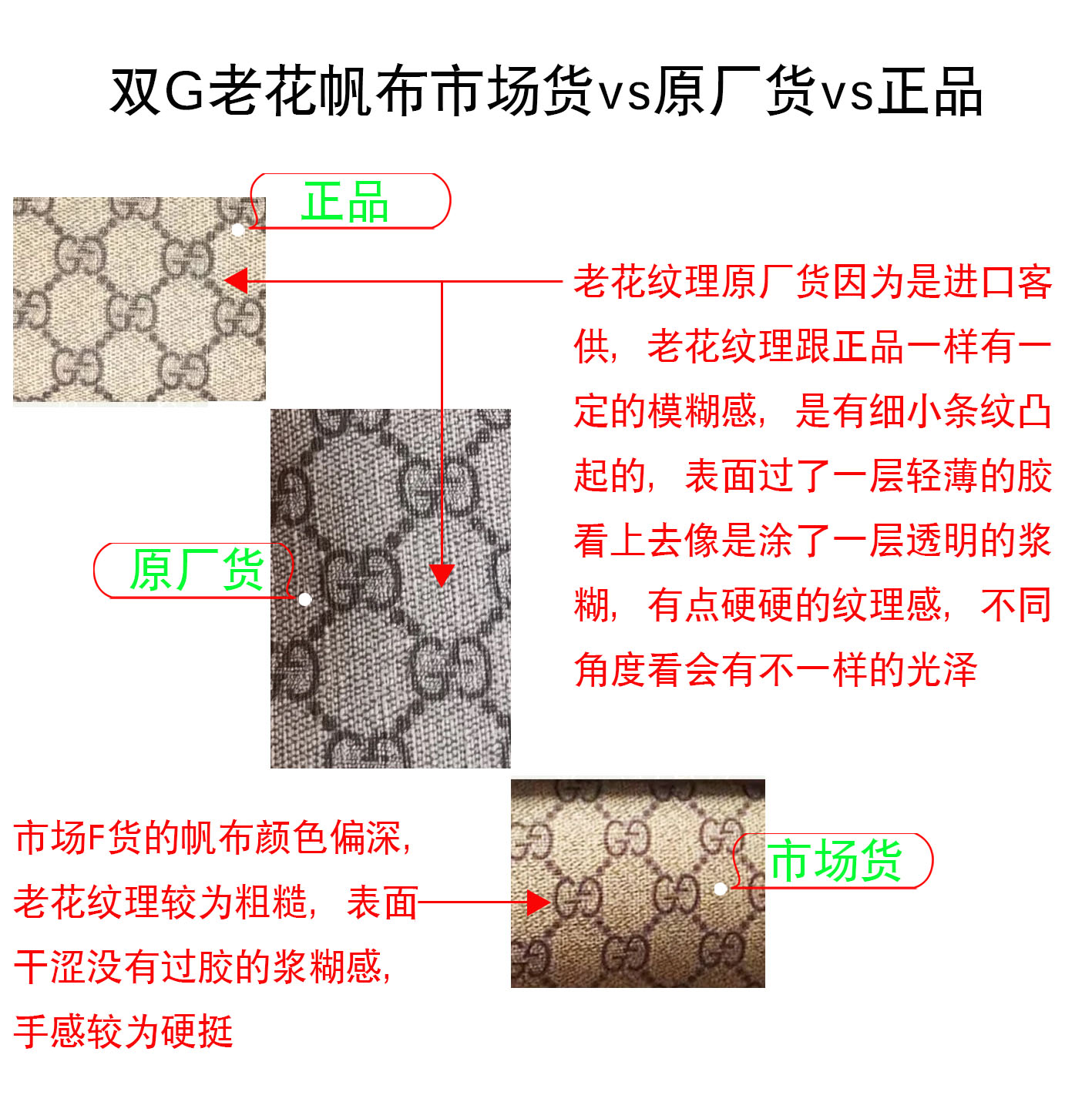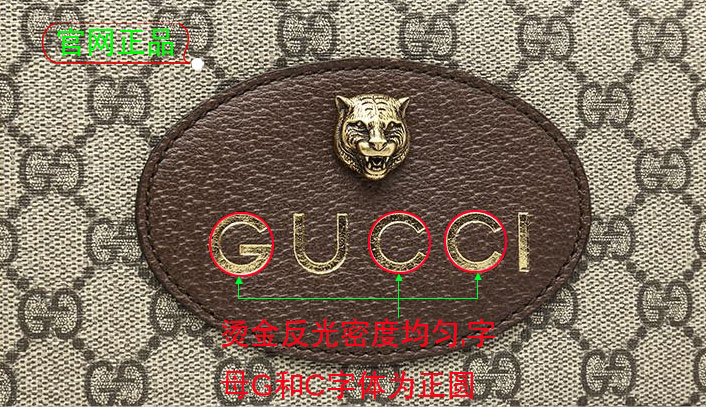 正品双G老花纹理有一定的模糊感,表面有细小的立体条纹的,而且表面像是涂了一层轻薄如雾的浆糊,有点硬硬的纹理感,看上去不乏复古感;市场F货双G老花帆布颜色不是较深就是较浅,现在仿的很好高版本已经克服了这一点,总体跟正品差不多,不建议大家从这方面辨别。