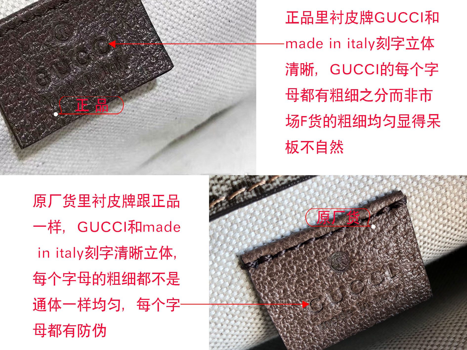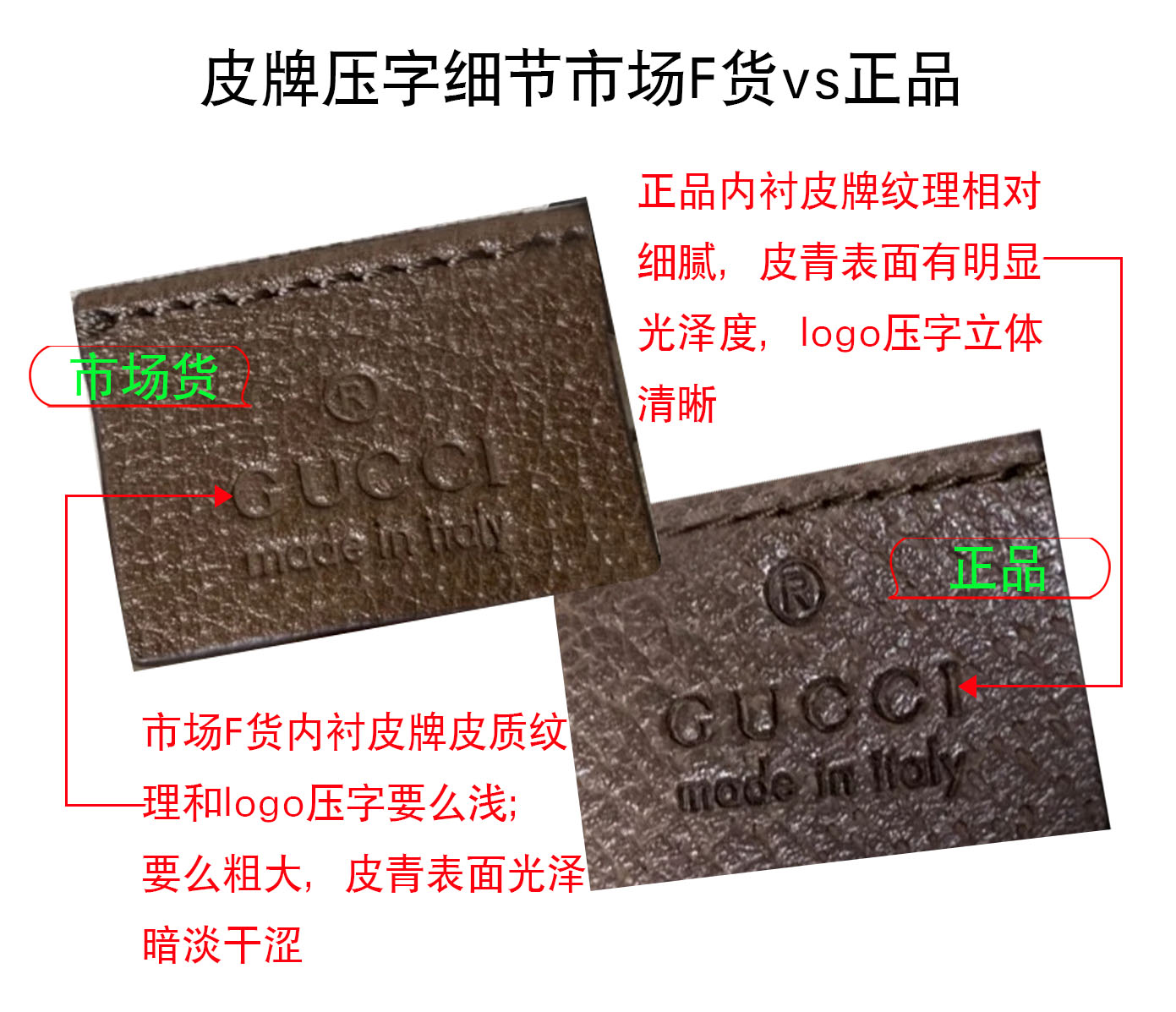 正品刻字立体感明显,轮廓清晰,每个字母都有加深加粗的感觉,因为是牛皮标,粒面纹理感强;表面些许油光感。而市场F货logo刻字比较浅,立体感不够强,而且字母槽深浅不一。