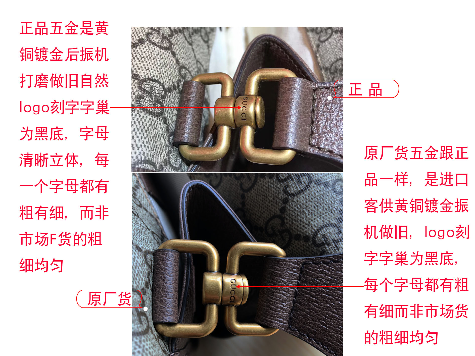 正品肩带扣五金是采用黄铜厚镀真金振机做旧工艺,刻字字槽是黑色,字母粗细是不均匀的;五金连接轴与扣环吻合的刚刚好,既不会过于紧而使活动生涩,又不会过松而使五金接触面缝隙大不美观,时间久了会因为使用频率而松动。市场F货肩带扣五金外型厚壮不秀气,连接轴与扣环之间接触面缝隙较大不美观。