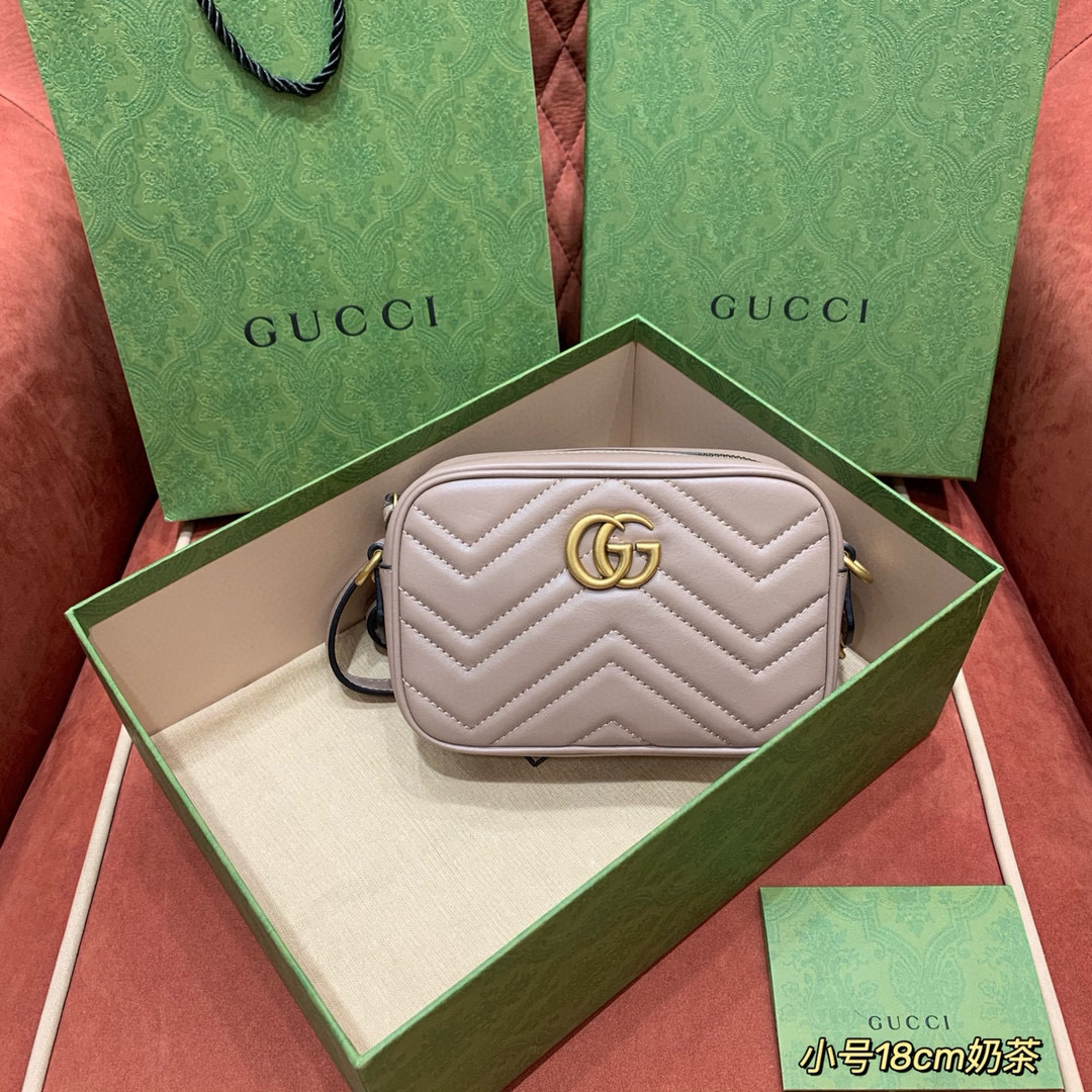 迷你GG Marmont系列鏈帶肩背包采用頗具結構感的柔軟造型和拉鏈封口,配以雙G金屬配件。采用波浪紋絎縫皮革,背面配以GG標誌。