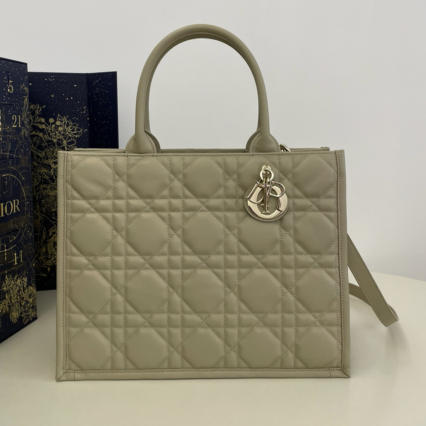 這款 Book Tote 手袋以優雅的風格煥新詮釋瑪麗亞·嘉茜婭·蔻麗 (Maria Grazia Chiuri) 的經典款式。采用胭脂米色牛皮革精心製作,突顯超大藤格紋圖案,飾以淺金色飾面金屬 D.I.O.R 吊飾。內部采用超柔軟皮革材質,設有一個拉鏈口袋和插袋,可妥善收納各種日常用品。中號款式,輕盈實用,搭配可調節、可拆卸肩帶,彰顯 Dior 的精湛工藝,可手提或肩背。