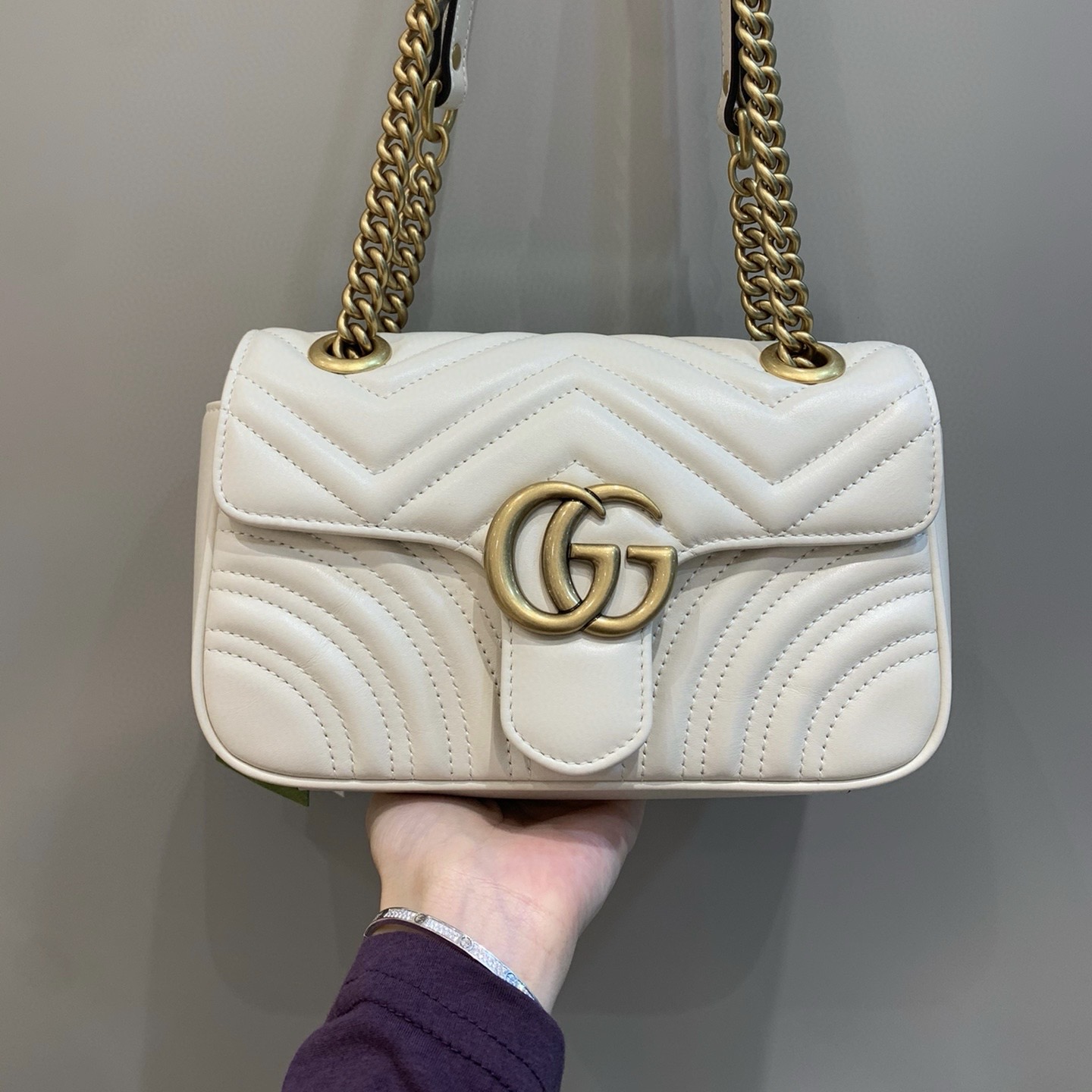 這款GG Marmont系列迷你手袋采用高辨識度造型、中性淺灰色絎縫V型皮革材質,包身略顯挺括,翻蓋開合設計,配有雙G配件。這款手袋采用了多樣化背法設計,輕松滑動金屬鏈即可在肩背包與手提包之間自如切換。