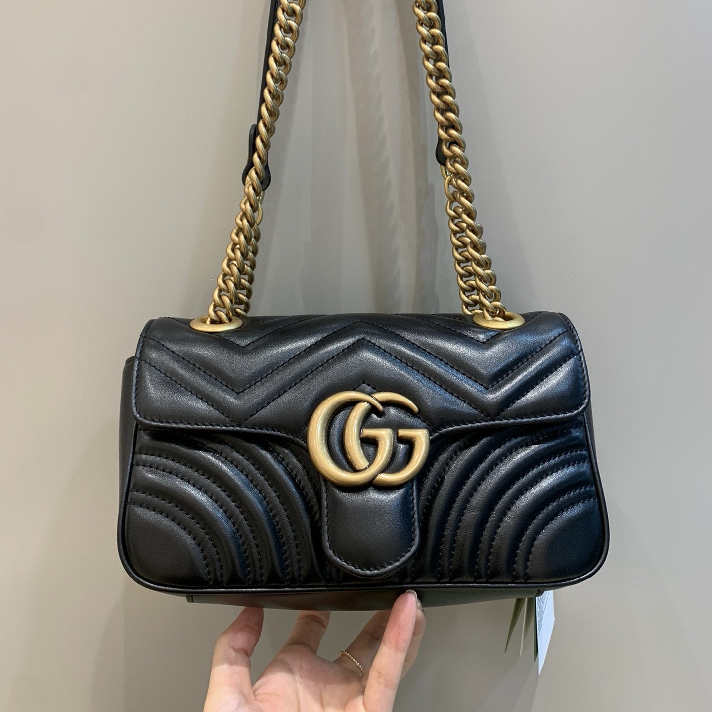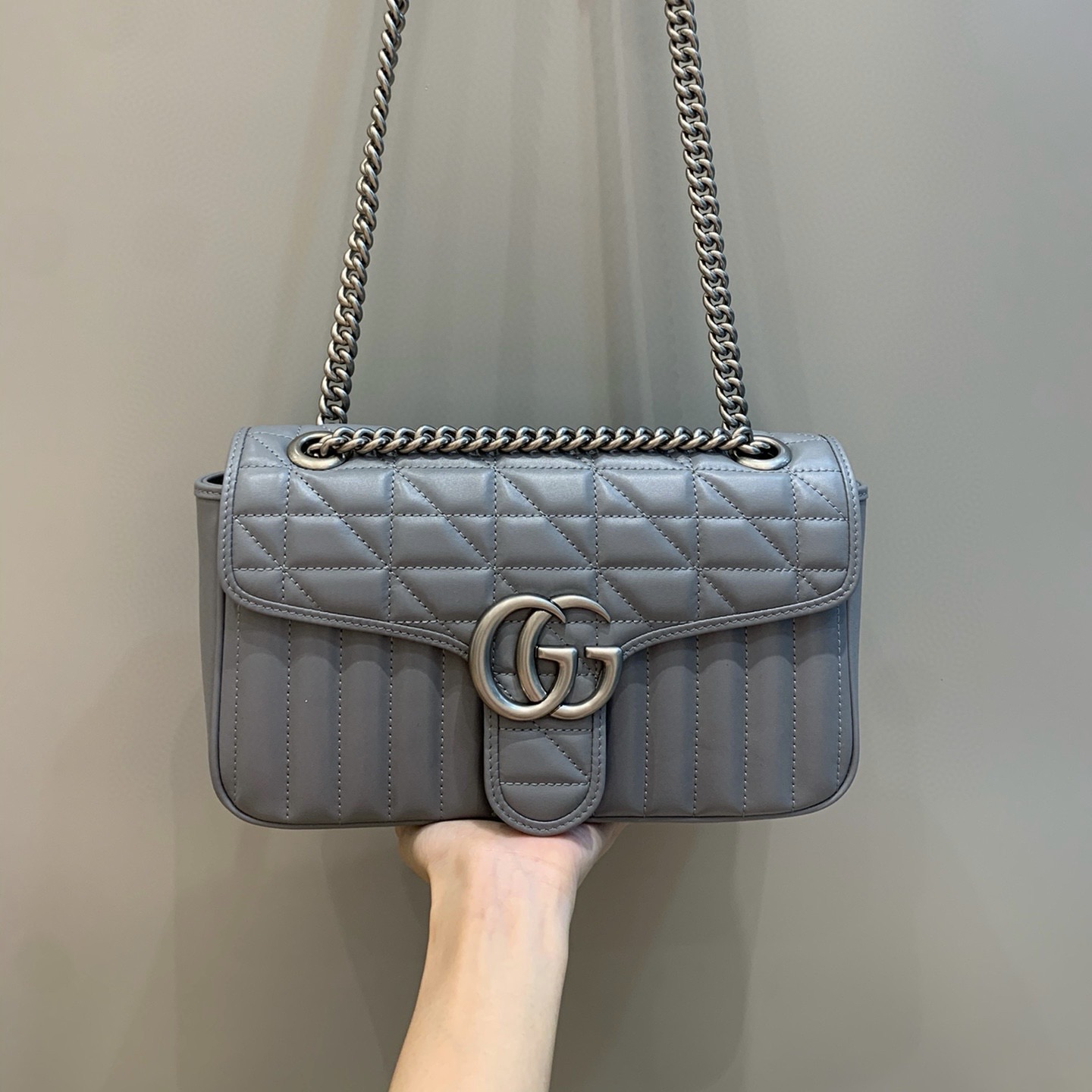 這款單品出自Gucci Lido系列,設計靈感源自意大利海岸的夏日風情和海灘俱樂部。小號GG Marmont鏈條肩背包采用頗具結構化的柔軟造型,超大號翻蓋扣配以雙G金屬配件。滑動鏈條包帶有多種背法,可在肩背和手提之間自由轉換。采用絎縫波V形花紋皮革,背面配以心形圖案。