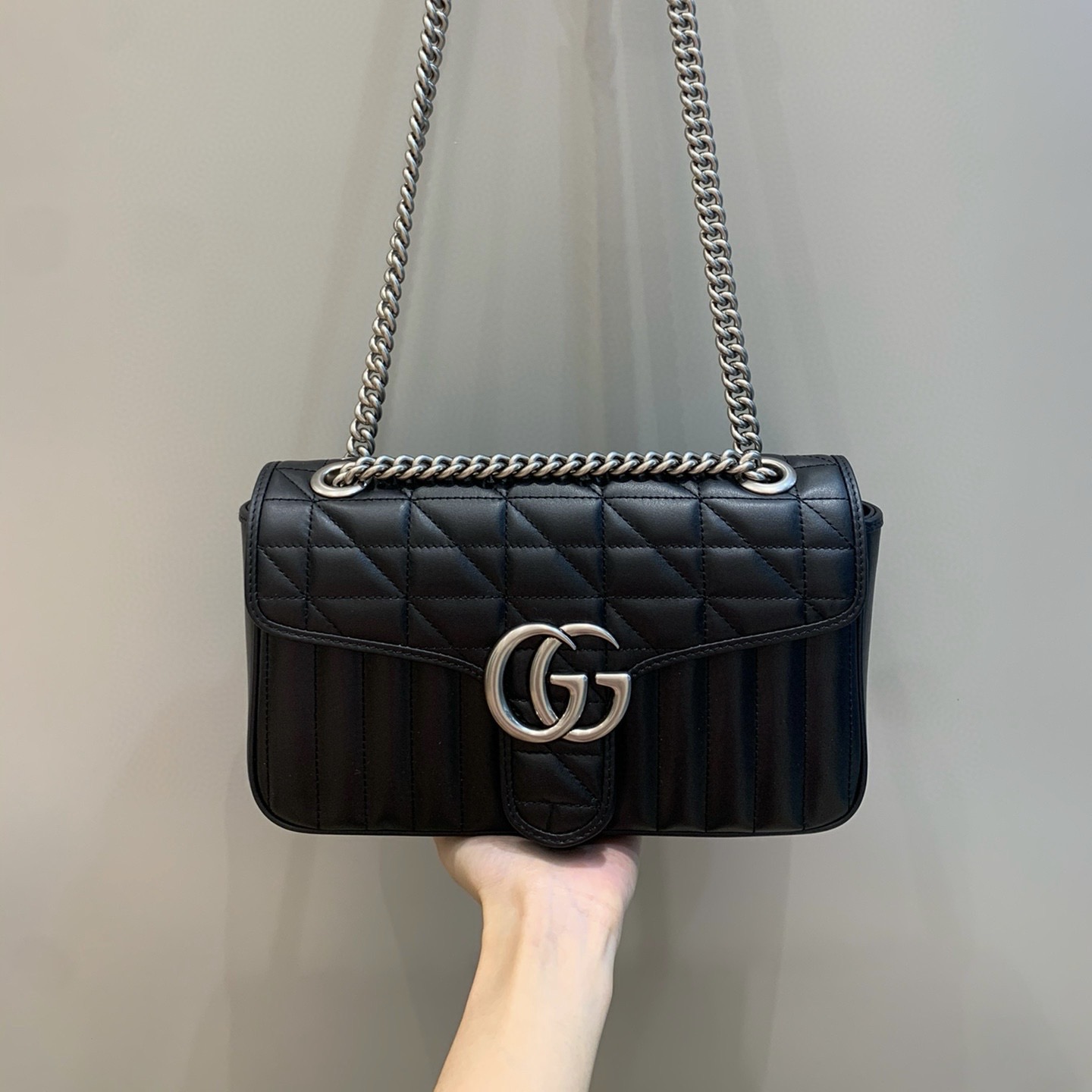 這款單品出自Gucci Lido系列,設計靈感源自意大利海岸的夏日風情和海灘俱樂部。小號GG Marmont鏈條肩背包采用頗具結構化的柔軟造型,超大號翻蓋扣配以雙G金屬配件。滑動鏈條包帶有多種背法,可在肩背和手提之間自由轉換。采用絎縫波V形花紋皮革,背面配以心形圖案。
