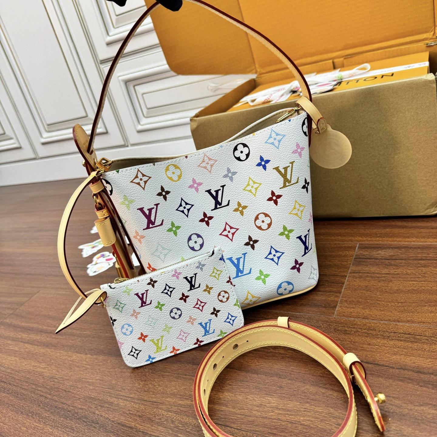 本款 Handbag East West 手袋出自路易威登 x 村上隆再版系列,以藝術家筆下標誌性的彩虹色調描摹全幅 Monogram 圖案。橫向構型線條流暢,頂部手柄、飾釘側帶、可拆卸並調節的肩帶和 LV x TM 鑰匙包融入牛皮革細節,考究包角致意品牌傳統行李箱設計。