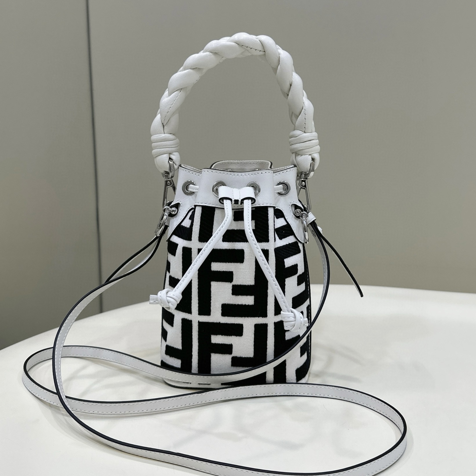 Mon Tresor小號水桶包,配有抽繩和Fendi標誌形狀金屬細節。一長一短兩條可拆卸肩帶,讓手袋可手拿、肩背或斜挎。小牛皮材質。標誌性壓花及手繪的黑色FF圖案。金色飾面金屬細節。