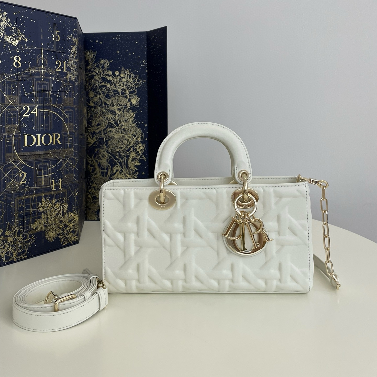 這款 Lady D-Joy 手袋凸顯 Lady Dior 系列的簡約美學,集中體現了 Dior 對優雅和美麗的深刻洞見。采用黑色牛皮革精心製作,飾以 Graphic 藤格紋圖案,以 3D 效果的時尚版本全新演繹 Dior 的經典圖案。搭配淺金色飾面金屬 D.I.O.R. 吊飾,為精美的輪廓增添一分靈動。中號款式,搭配可拆卸的鏈條肩帶和可調節、可拆卸的皮革肩帶,可手提、肩背或斜挎,是日常造型的理想之選。