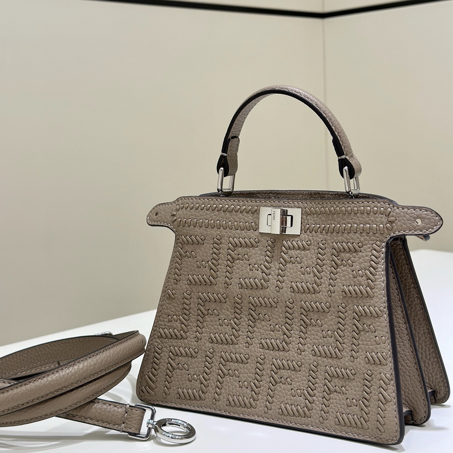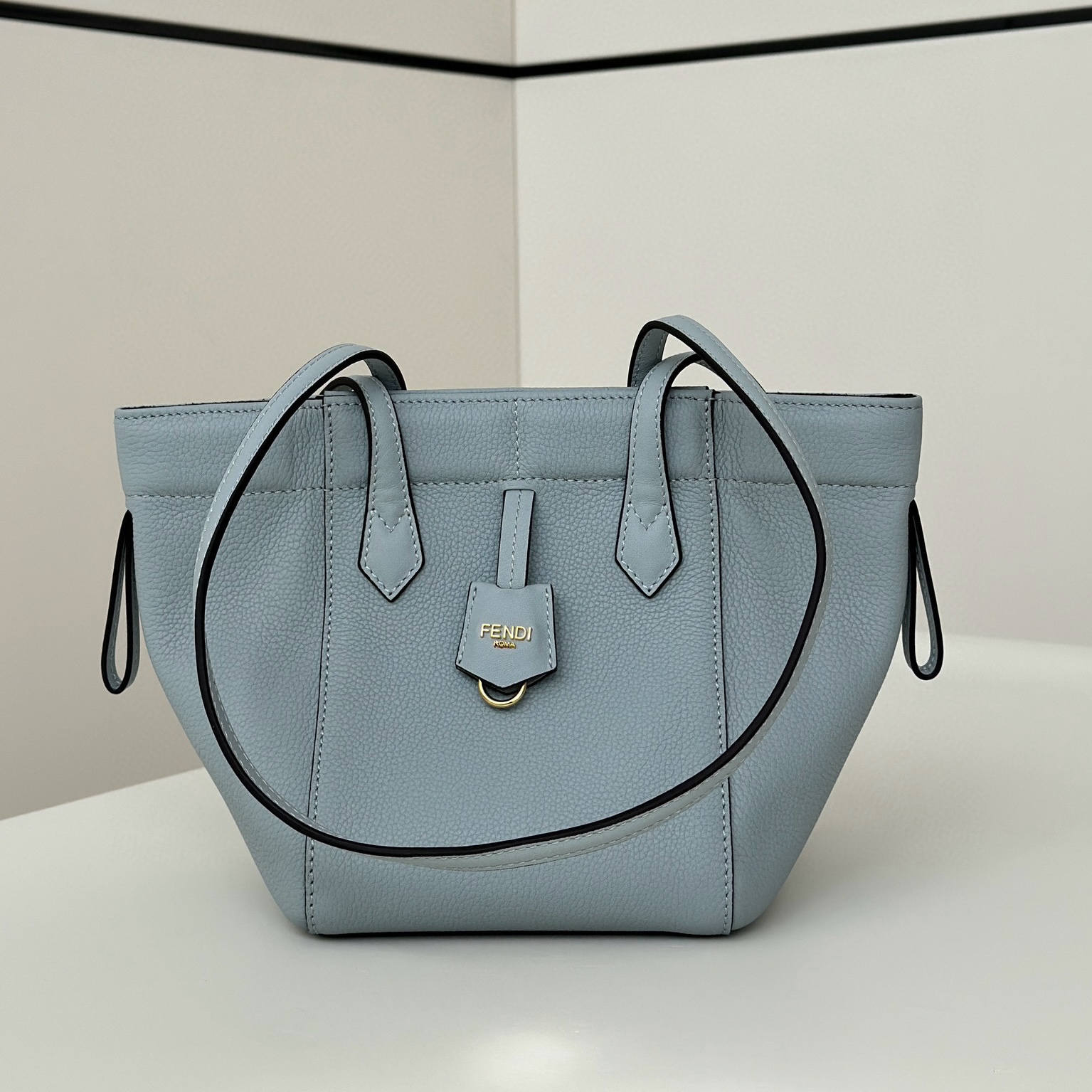 Origami迷你手袋,粒面皮革。該款式以可變形的創新設計,彰顯FENDI的雙面性和創意:配有8個磁扣組成的靈活機製,可以折疊成折紙風格的水桶包,磁鐵都吸在中間的磁扣上時,輕輕拉一下兩邊的短肩帶,就變身成了手提袋。