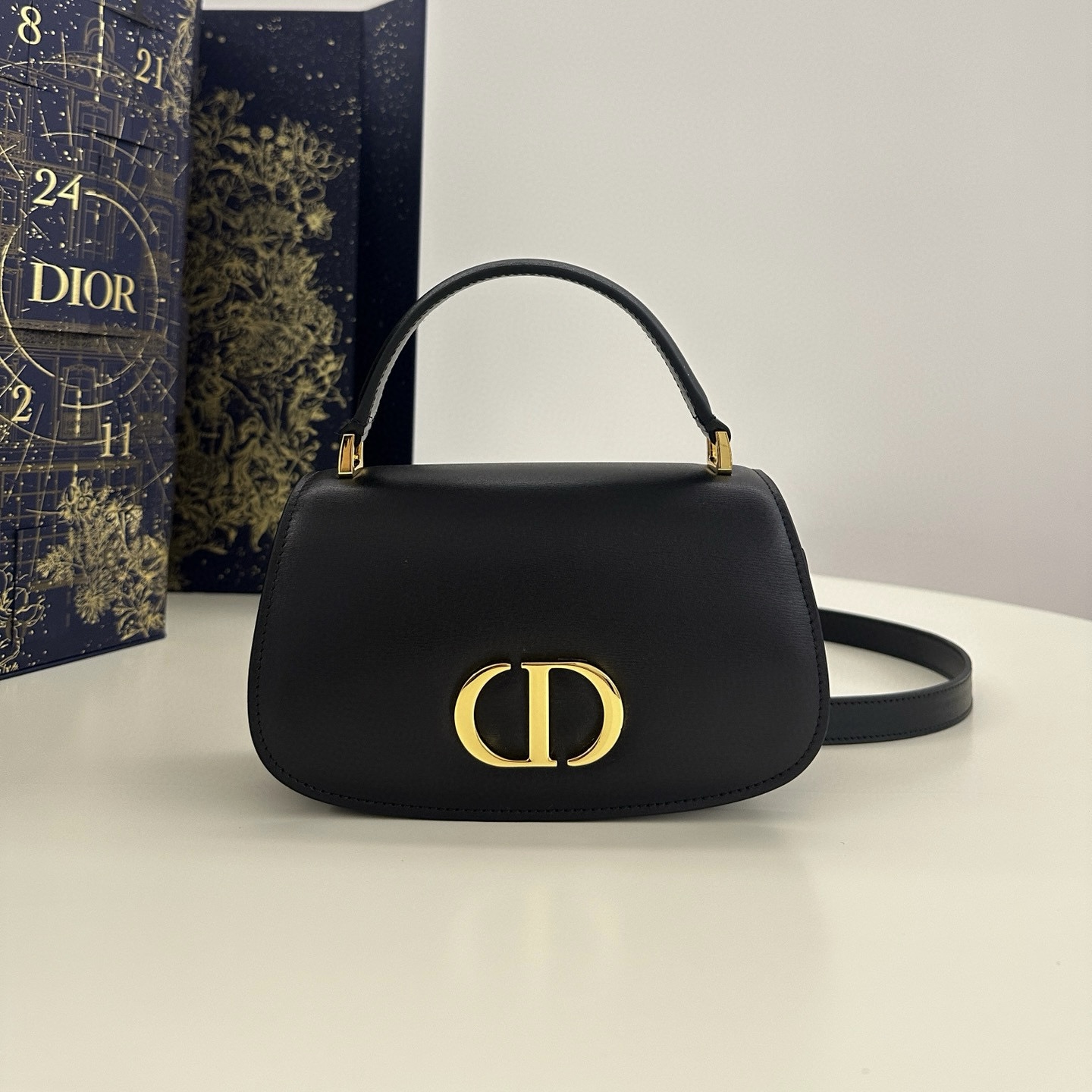 這款 30 Montaigne Avenue Top Handle 手袋是二零二四冬季成衣系列新品,展現優雅氣質與現代風格,別具一格。采用精美耐用、質感豐富的黑色牛皮革精心製作,彰顯 Dior 的精湛工藝。翻蓋點綴以復古金色飾面金屬 CD 標誌,雙隔層縫有三角形襯料,另設有背面插袋,更加實用。中號款式,搭配皮革頂部手柄和可調節、可拆卸肩帶,可手提、肩背或斜挎。