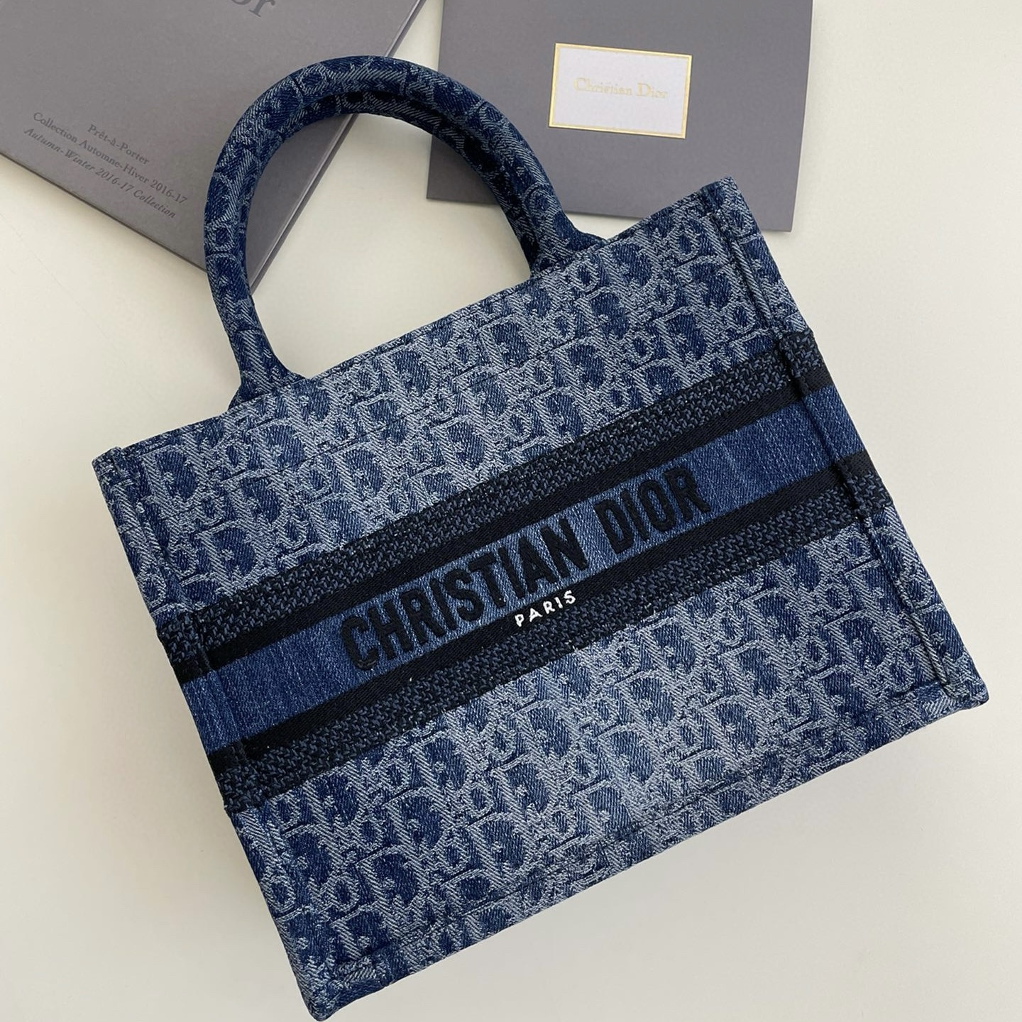 這款 Dior Book Tote 手袋由 Dior 女裝創意總監瑪麗亞·嘉茜婭·蔻麗 (Maria Grazia Chiuri) 設計,是體現 Dior 美學的主打產品。可收納各種日常用品,采用藍色 Denim Dior Oblique 提花面料精心製作,以不規則的石洗效果煥新演繹 Dior 的經典圖案,彰顯現代魅力。小號款式,正面飾以對比鮮明的 Christian Dior Paris 標誌,彰顯 Dior 的精湛工藝,可手提。