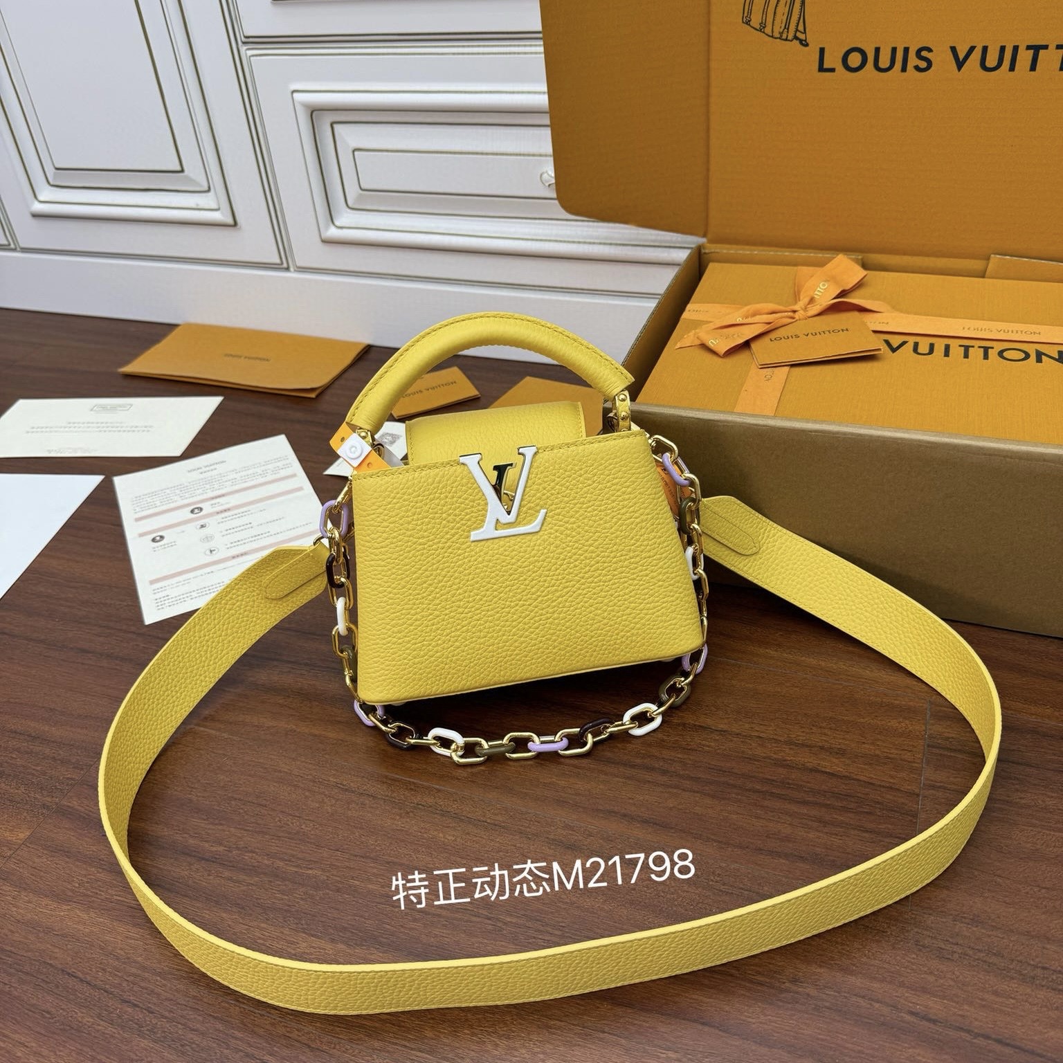 本款 Multi Pochette Accessoires 手袋取材 Monogram Empreinte 皮革,先後以壓印和印花工藝描繪大號 Monogram 圖案。金屬件銜接的手拿包、鏈條和肩帶均可拆卸,二合一設計實現多種造型方式。
