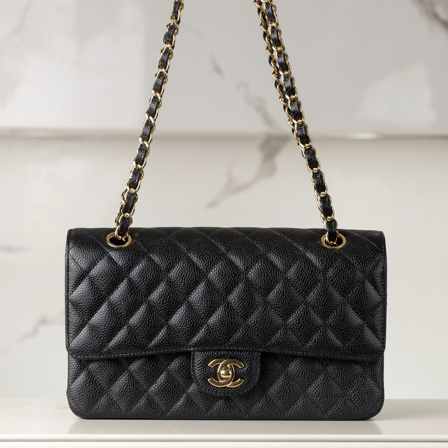 CHANEL包包官方網站經典款式 黑金大號顆粒壓花小牛皮口蓋包
