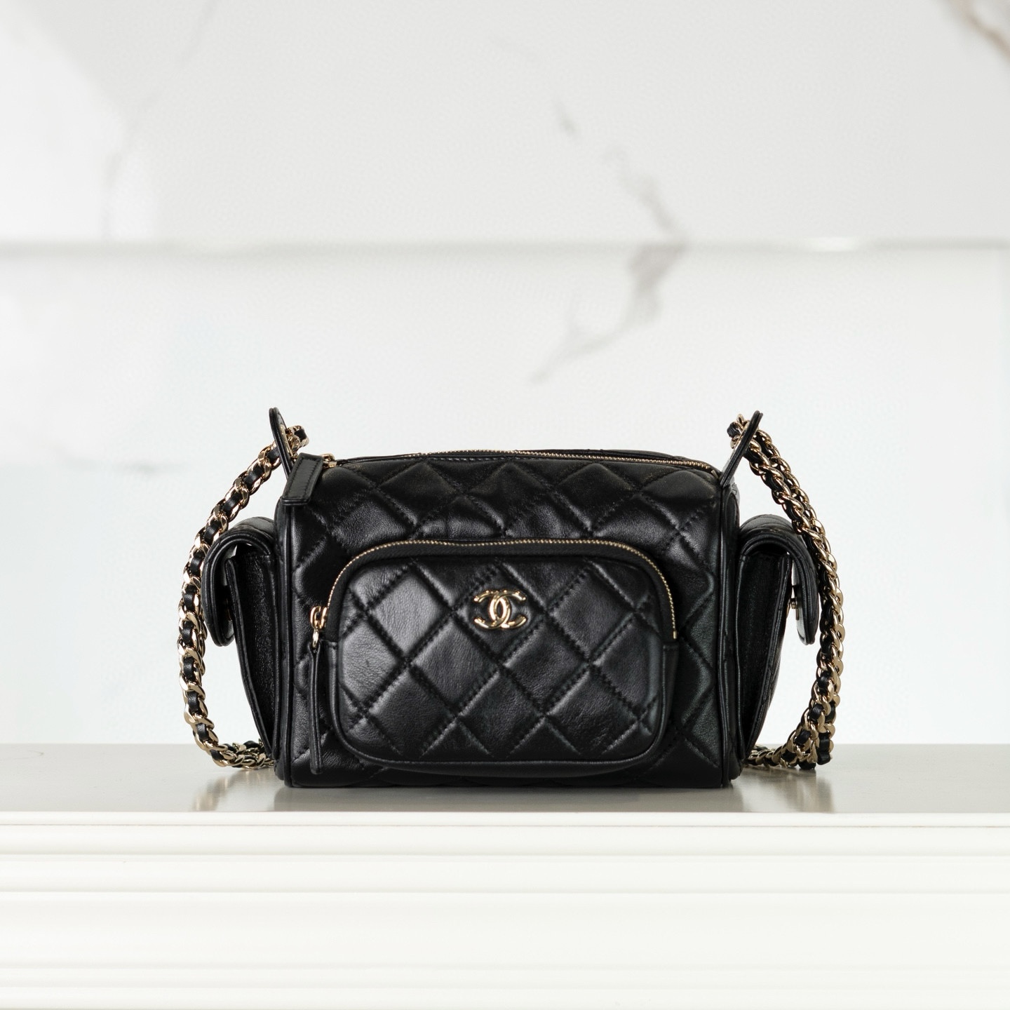 CHANEL包包Dubai官網亮面皺紋小羊皮相機包 鏈條手袋