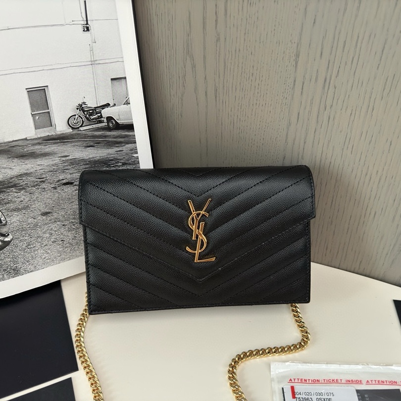 正面翻蓋鏈條錢包,飾以經典YSL字母標誌和V形絎縫包縫,搭配可拆卸皮革和鏈條肩帶。