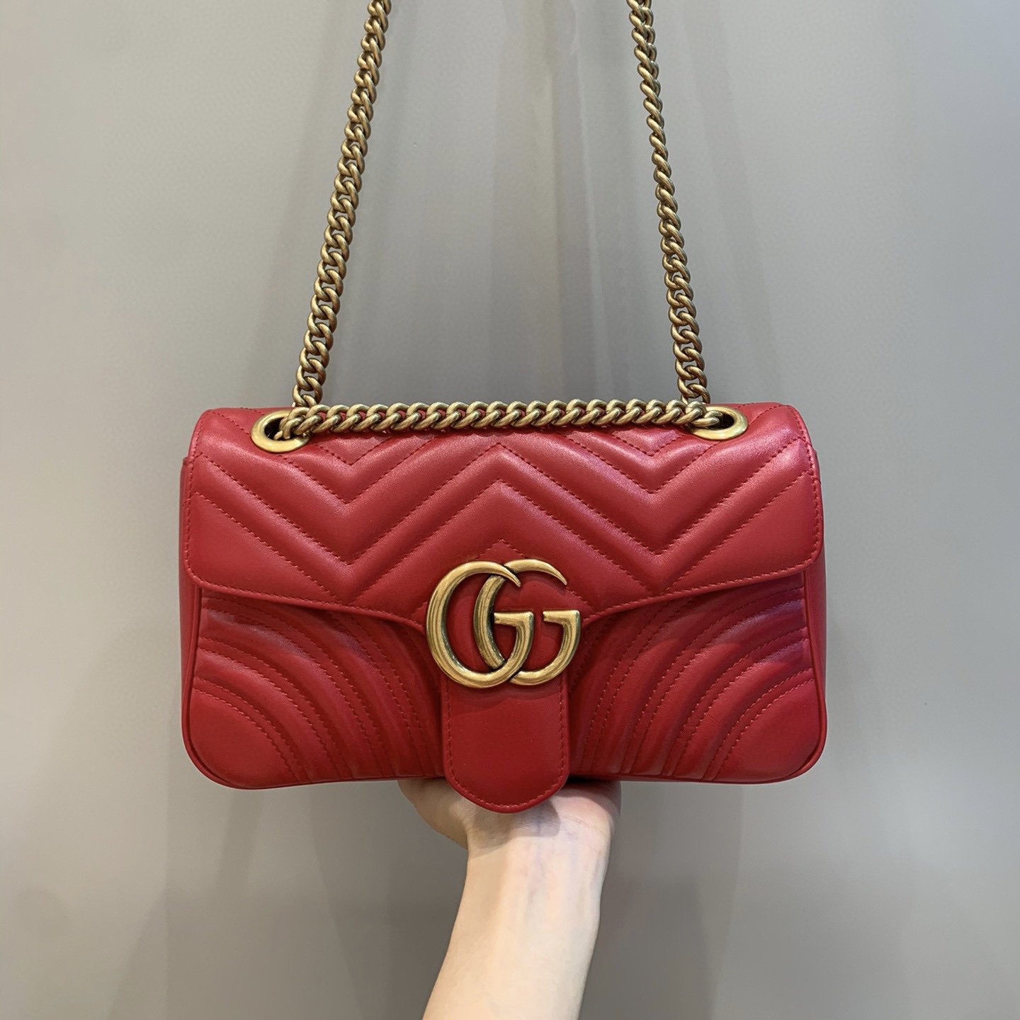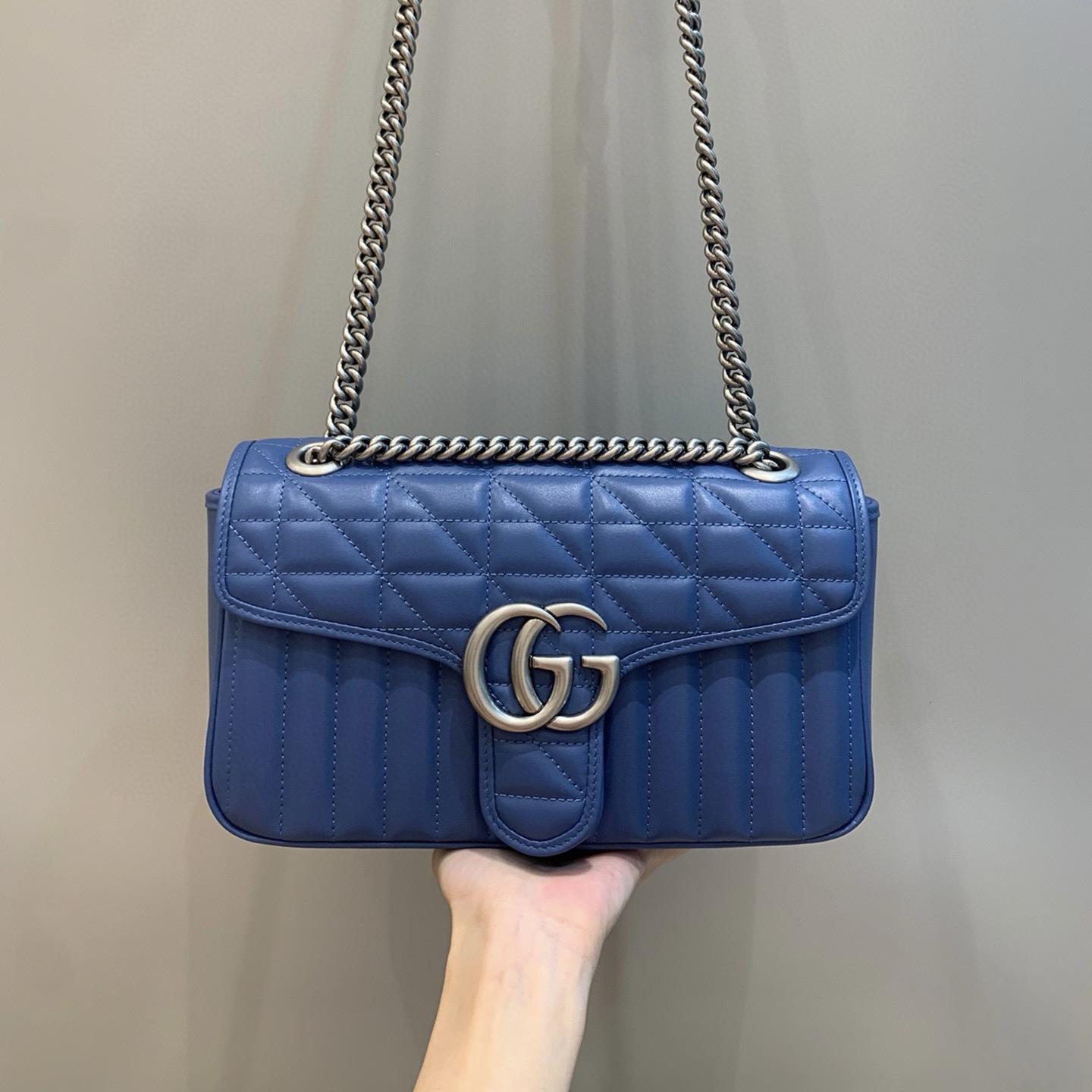 小號 GG Marmont系列鏈帶肩背包采用頗具結構感的柔軟造型和超大號翻蓋封口,配以雙 G 金屬配件。可滑動鏈條肩帶有多種背法,可在肩背和手提之間自由轉換。采用波浪紋絎縫皮革,背面配以 GG 標誌。
