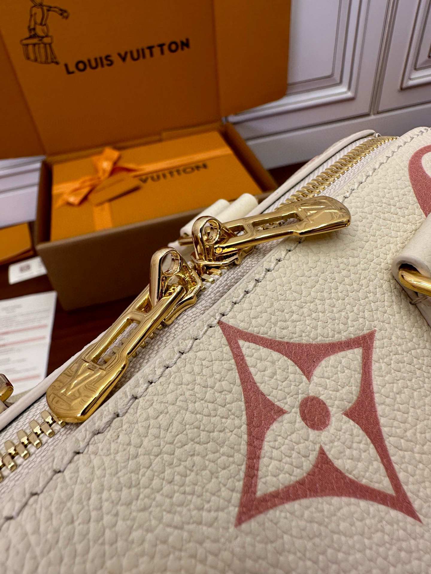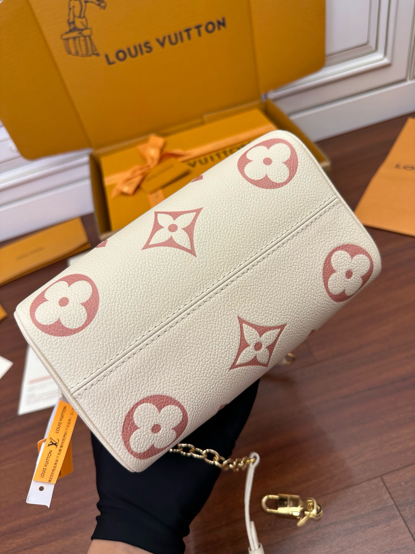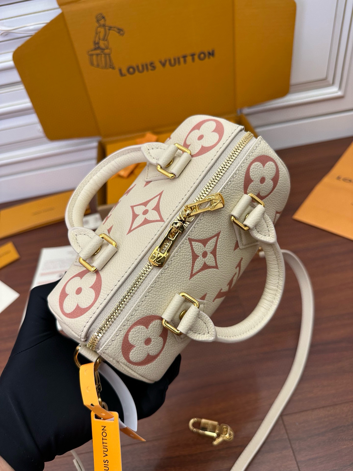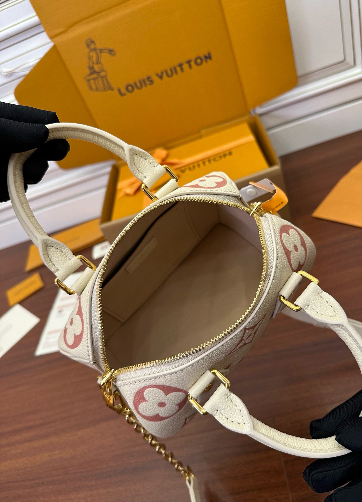 由雙色 Monogram Empreinte 皮革製成,飾有 LV 標識與 Monogram 花卉圖案,此款 Speedy Bandoulière 20 手袋堪稱摩登經典之作。設計靈感源於 1930 年代的 Speedy 旅行箱系列,還原最初的造型與鉸接式手柄。配有皮革金屬鏈包帶,便於肩背和斜挎。
